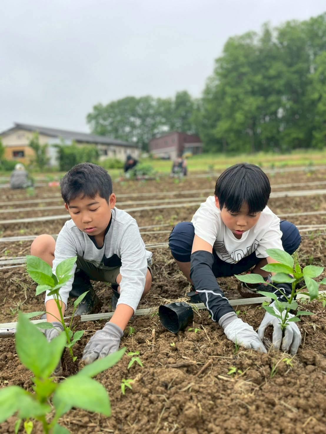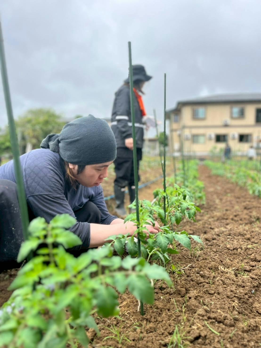 この日の作業では、マルチの穴が余っていたため、さつまいもを50株追加で植えたほか、トマト約140株、ピーマン約50株、そして前日に植えきれなかった、なす約30株を定植しました。