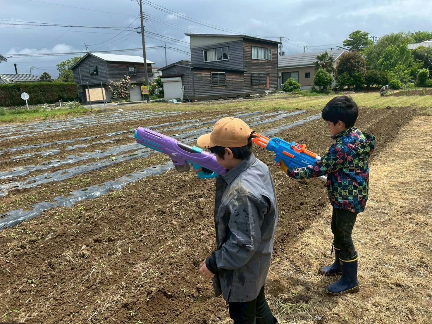 子どもたちの参加も多く、作業の合間には笑い声が響くにぎやかな雰囲気に。途中で飽きてしまうことを想定し、前山さんが用意してくれた水鉄砲が大活躍し、子どもたちは水遊びに夢中になって楽しんでいました。