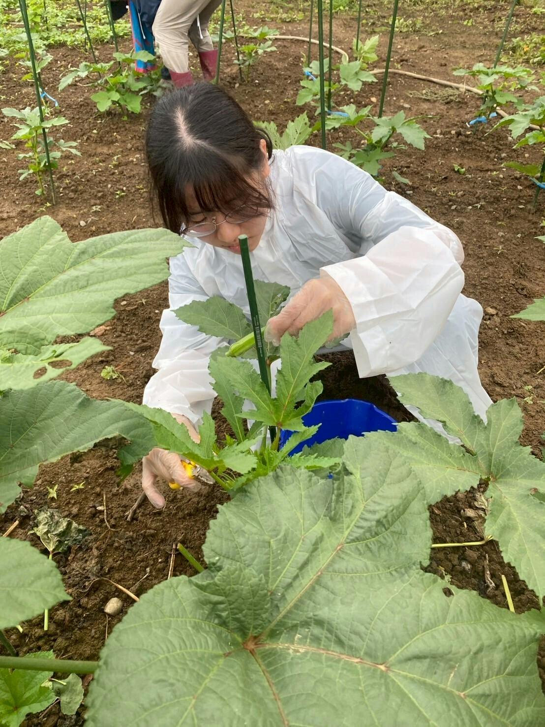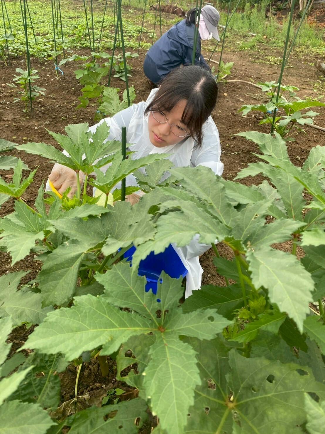 野菜の収穫をしながら、支柱に苗を結ぶ作業。