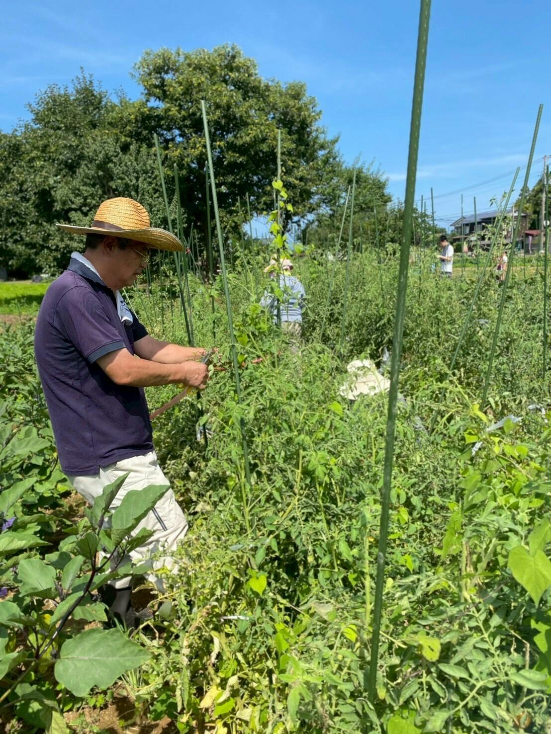 本日の作業は、野菜の収穫、支柱に野菜の苗の固定、草取り。