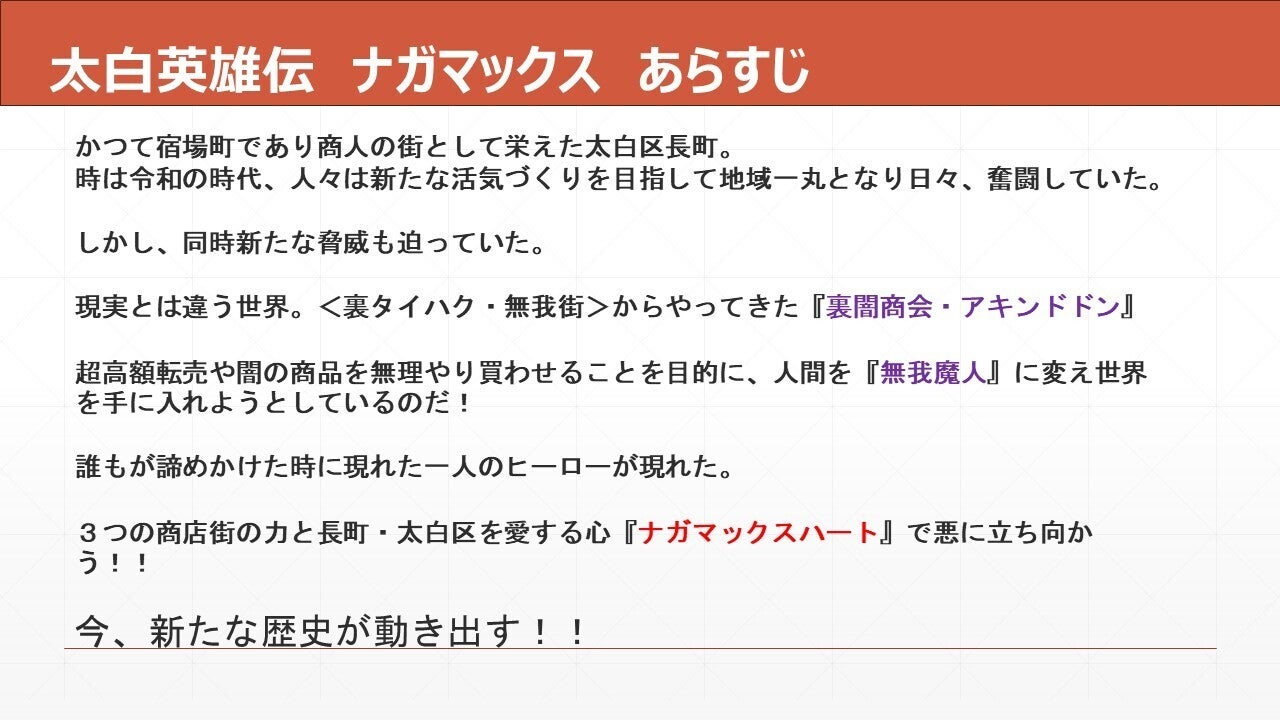 「ナガマックス」は太白区の魅力を伝え、活気と笑顔に溢れた大人も子どもも楽しめる親しみやすいヒーローショーを目指し、ご当地ヒーローだから届けられる地元への愛を、全力で発信します!