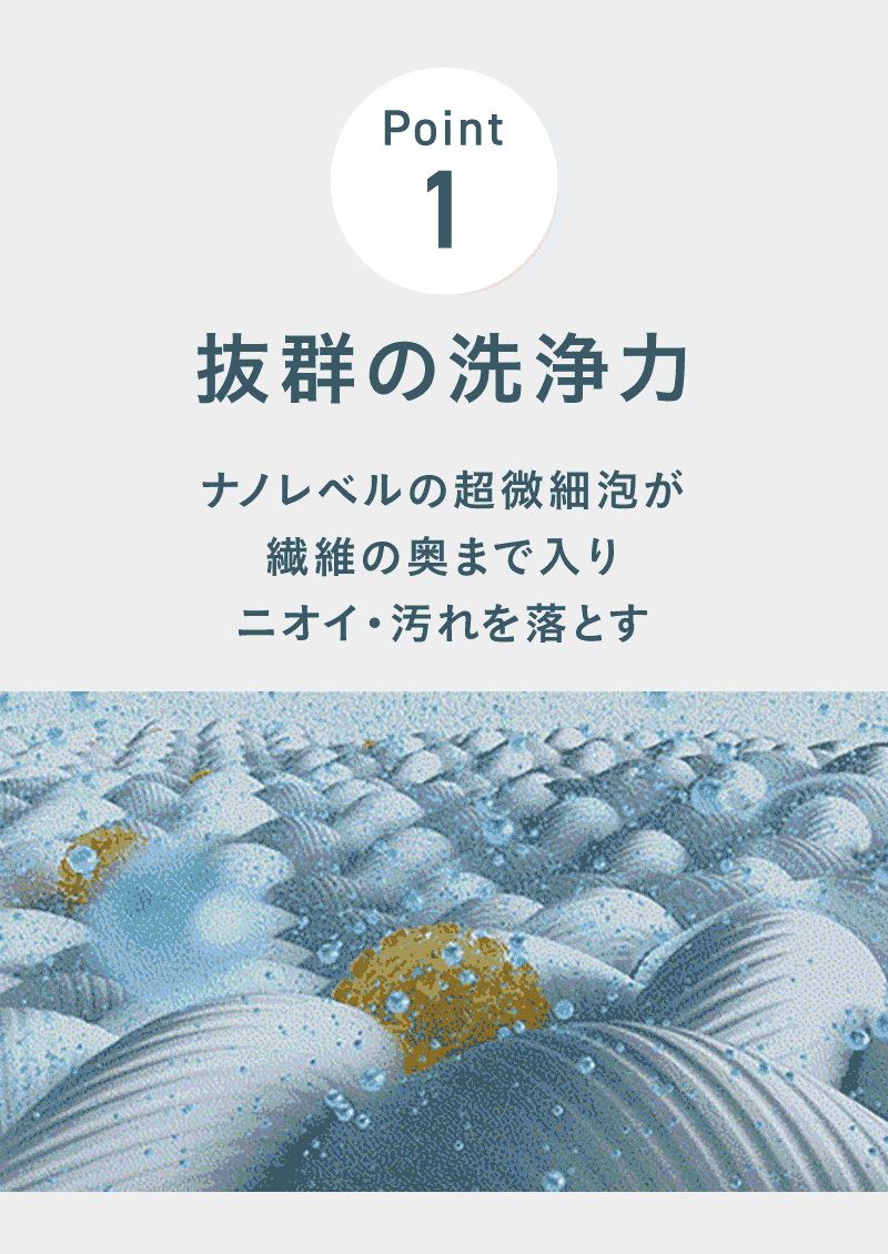 ナノレベルの細かい泡が衣類や洗濯槽のバイオフィルムを剥がし、菌を不活化させます。