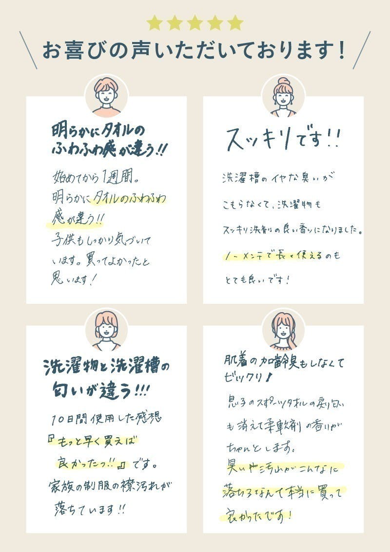 ヌメヌメになった配管の中やこみ上げてくるイヤ~なニオイ・衣類についた部屋干し臭、汗臭も泡の力で洗浄してくれます。さらに抜群の仕上がり効果も!通常の泡では届かない、繊維の中までナノバブルが届き、洗濯物の仕上がりがとても良くなります。長い間使ったタオルもふわふわのタオルに。