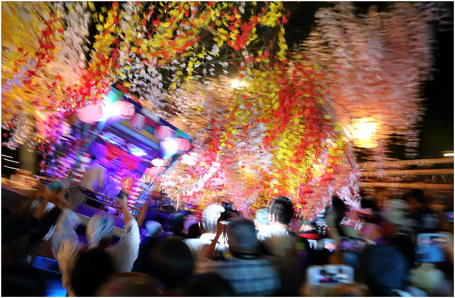 神輿の宮入り後は、4台の太鼓台がぶつかり合う「けんか太鼓台」、この頃には辺りも暗くなり、見渡せば人の山。華やかな飾り付けがなされた太鼓台と人々の熱気で祭りのテンションは最高潮に達します。