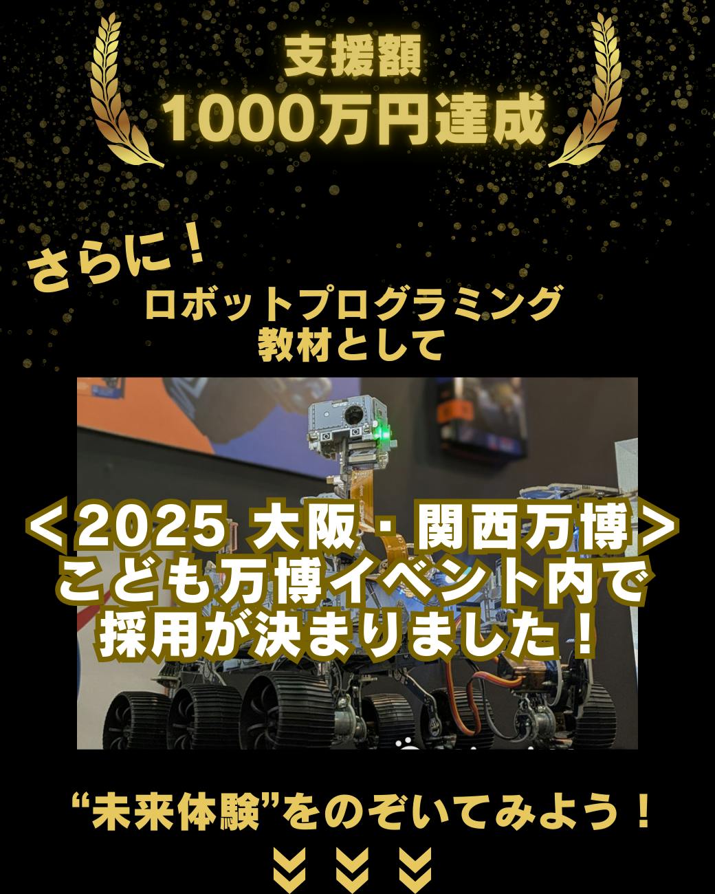 2025/10/20 09:40ご支援、本当にありがとうございました!このたび、NASA公認ロボットキット プロジェクトは支援者数 315名/支援総額 13,010,205円を達成し、無事に終了いたしました!たくさんの応援と温かいメッセージをいただき、チーム一同、心より感謝申し上げます。皆さまのご支援があったからこそ、ここまでの結果を残すことができました。これからは、皆さまのもとへロボットキットをお届けする準備に入ります。お届けまで誠意を持って対応いたしますので、どうぞご安心ください。発送スケジュールや最新情報は、今後も活動報告を通じてお知らせいたします。引き続き、見守っていただけますと幸いです。改めまして、心より感謝申し上げます。皆さまと共に、これからもワクワクする挑戦を続けてまいります。NASA公式ロボットキットプロジェクトチーム一同 もっと見る