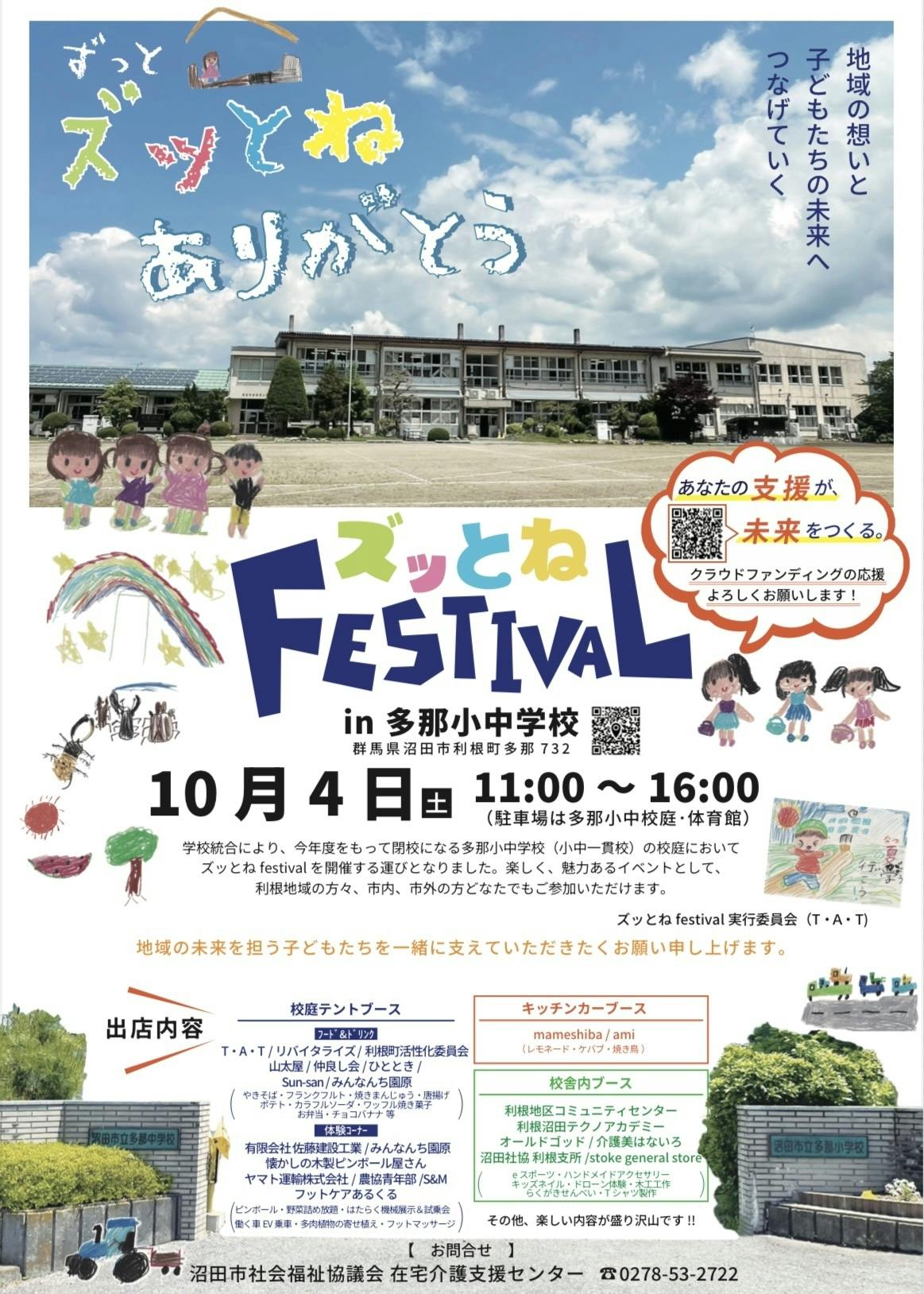 学校統合により、今年度をもって閉校になる群馬県沼田市利根町に所在する多那小中学校(小中一貫校)の校庭において、本年10月4日(土)子ども向けイベント“第2回ズッとねフェスティバル”を開催する運びとなりました。開催するにあたり、多那小中学校の児童・生徒や保護者、卒業生のほか、利根町にゆかりのある方など大勢を巻き込んで、楽しくそして魅力のあるイベントを開催したいと考えております。