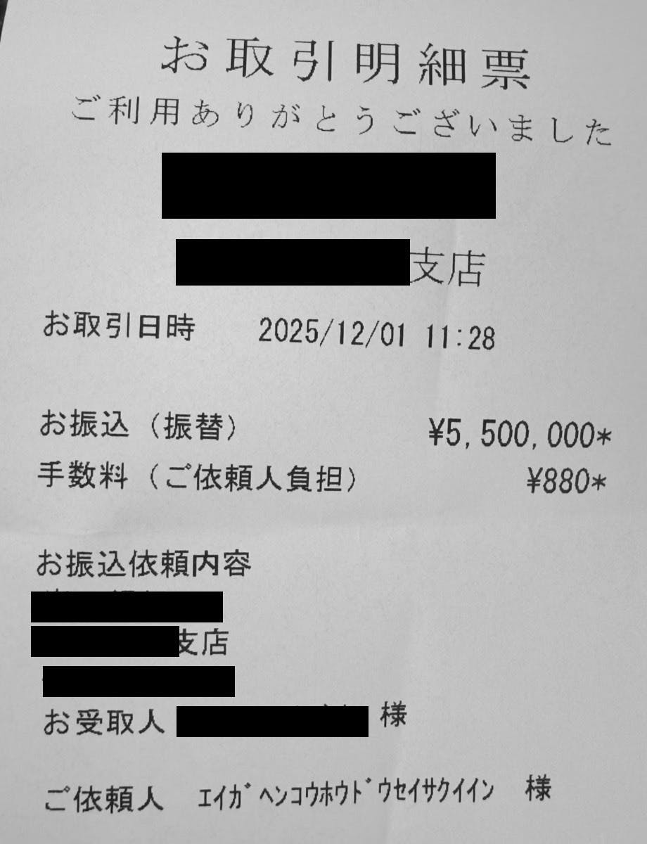 クラウドファンディングで皆さんからご支援いただいた分から、こちらの振り込みで使わせていただきました!本当にありがとうございます!