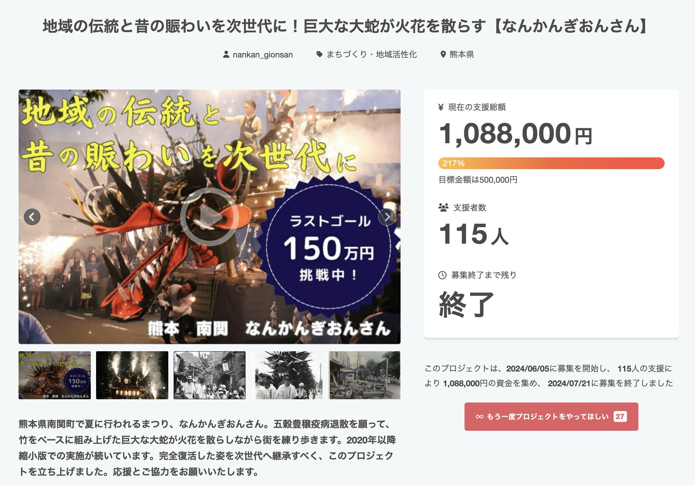 これまで、町内の事業者からの協賛金を主に運営費を賄っていたなんかんぎおんさんにとって、クラウドファンディングは、町外からの支援、また事業者だけでなく個人からの支援を集めるという意味でも初めての挑戦でした。