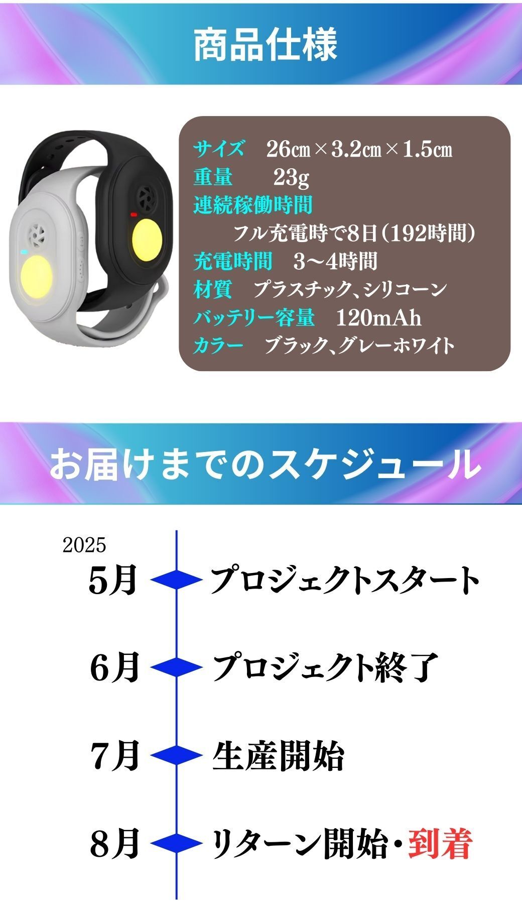 ※本文中に記載させていただいたスケジュールは、あくまでプロジェクト公開時点の予定です。支援購入の性質上、配送遅延のおそれがございます。