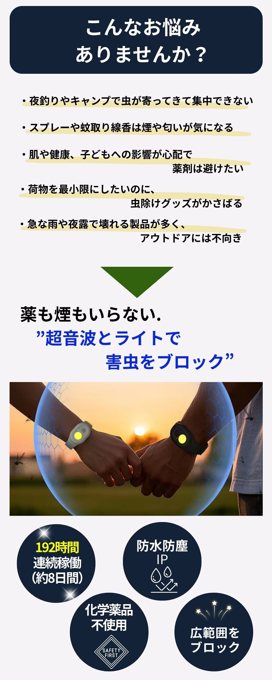 「SONIC SHIELD」は、蚊の嫌がる特定の超音波と蚊の嫌いな黄色のライトを発することで、薬剤や香りを使わずに蚊を寄せつけない新しいアプローチを採用。