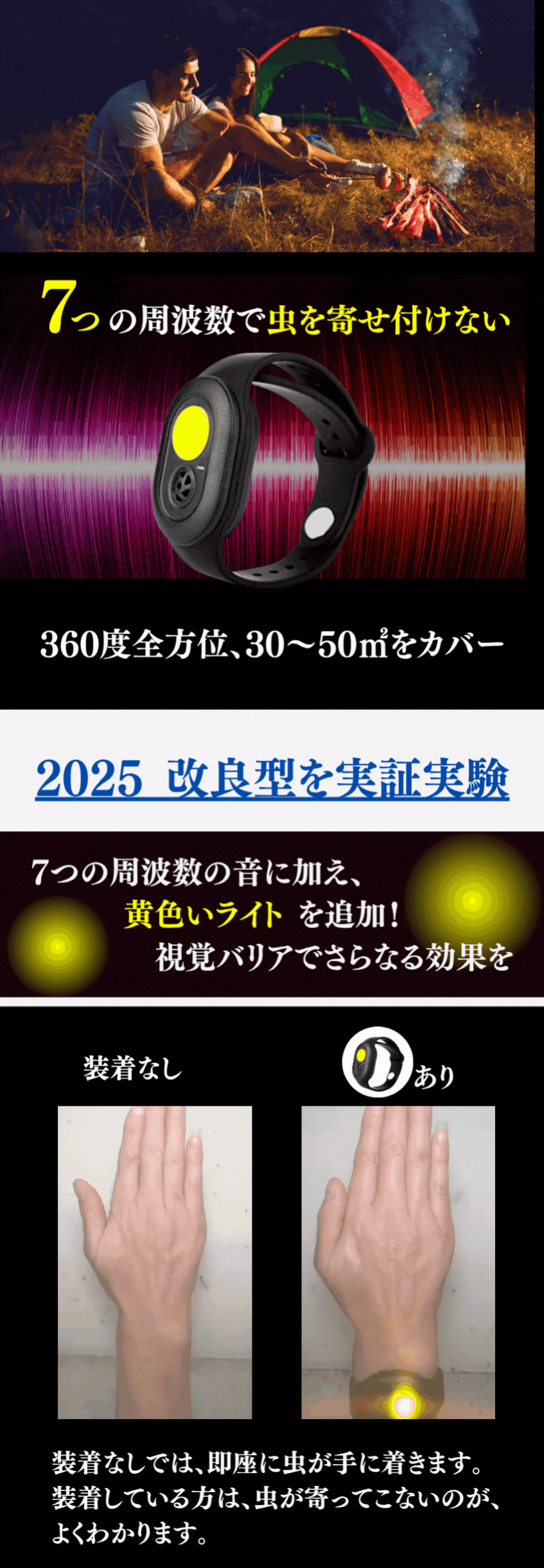 2025/06/10 19:21ご覧の皆様こんにちは。ご支援いただいた皆様、ありがとうございます。虫に悩まされる季節が到来しました。キャンプや夜釣り、庭でのひとときに、煙も薬剤も使わず虫を遠ざける「SONIC SHIELD」があれば、静かで快適な時間が手に入ります。手首に巻くだけ、超音波で虫をブロック。この夏の必需品です!クラファンだからこそのお値段。ぜひご支援お願いいたします! もっと見る