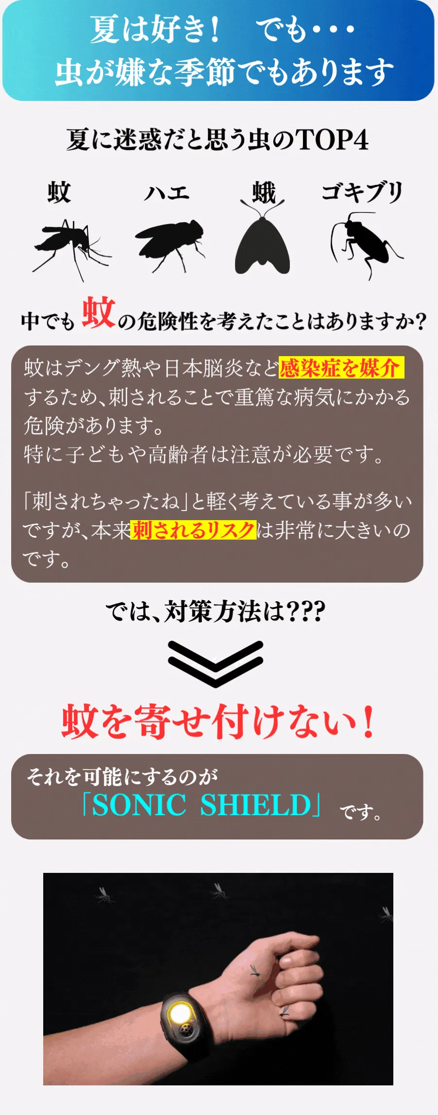 「SONIC SHIELD」を販売した経緯につきましては、近年、蚊が媒介する感染症やアレルギーへの懸念が高まっております。