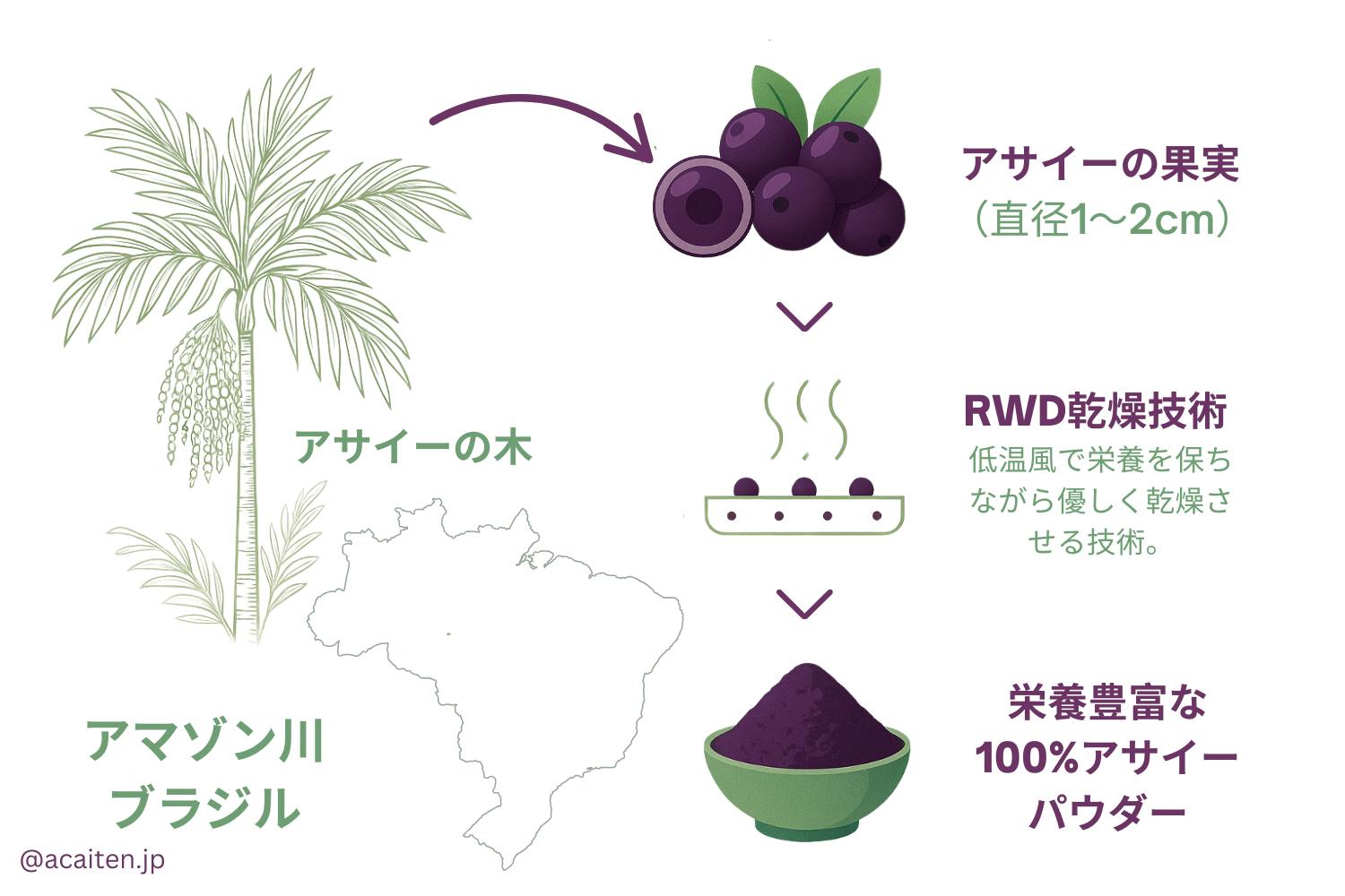 アサイーの果実は収穫後すぐに酸化が進むため、新鮮な状態で加工・乾燥されることが非常に重要です。私たちのアサイーは、現地の契約農園から直送され、栄養を壊さない特殊な技術(RWD乾燥)で粉末化されているため、新鮮で栄養価の高いまま日本に届きます。