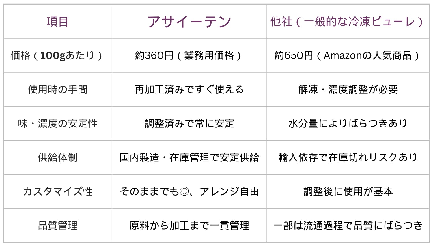 それに対して、Açaí Tenの製品は「再加工済み・すぐ使える」で提供されており、解凍不要で手間なく使用でき、常に安定した品質と濃度を保つことが可能です。また、日本国内で製造・在庫管理を行っているため、安定供給が可能で在庫切れのリスクも最小限です。