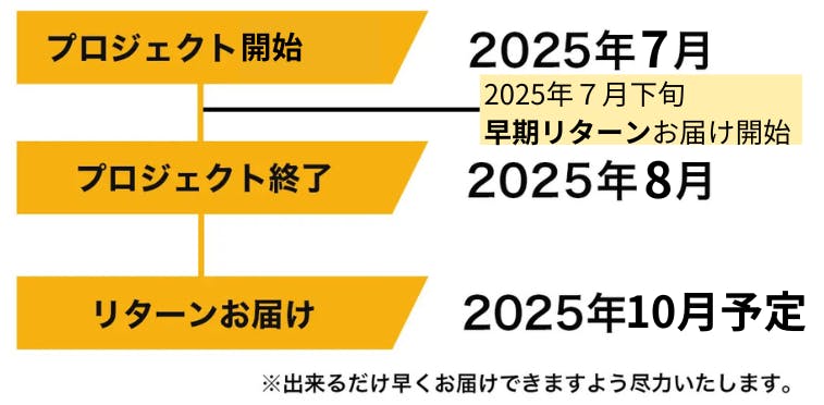 ●引渡し時期: 各リターン詳細に記載の発送予定月を引き渡し時期とします。但し、開発・生産状況によって遅れが生じる場合がありますのでその際は当プロジェクトページ内の「活動報告」または購入者へのメール等で連絡します。