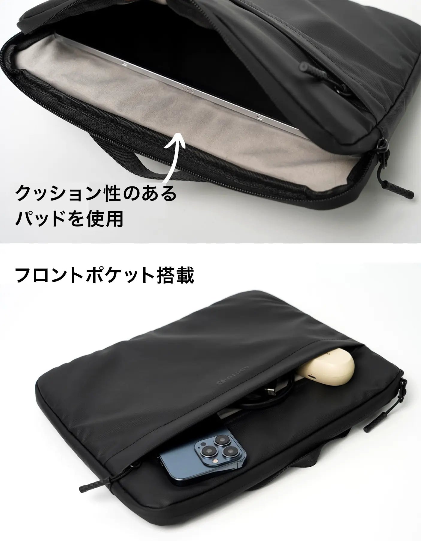 タブレットと一緒に、充電器やケーブル、ペンなどを収納できるフロントポケットも搭載。