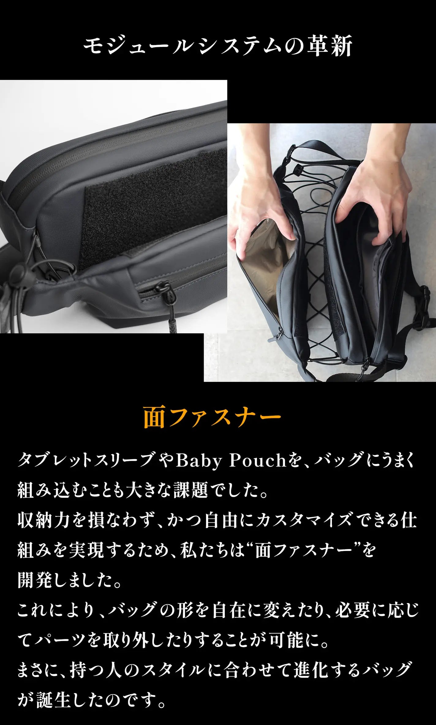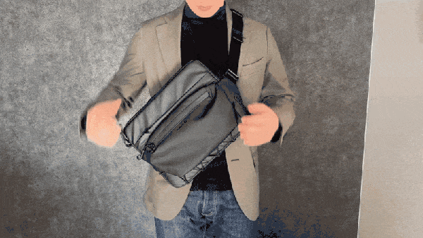 高機能の収納力と共に、「快適な持ち運び」設計も両立しました。人間工学に基づくように、身体にフィットするスリングバッグ形状を採用し、肩掛け・クロスボディの2WAYで使用可能。