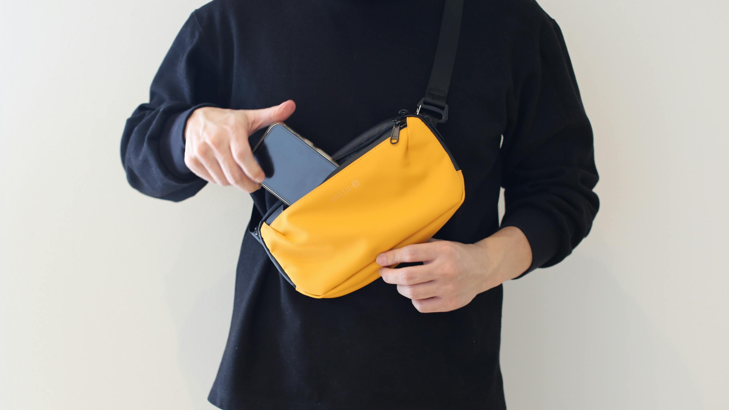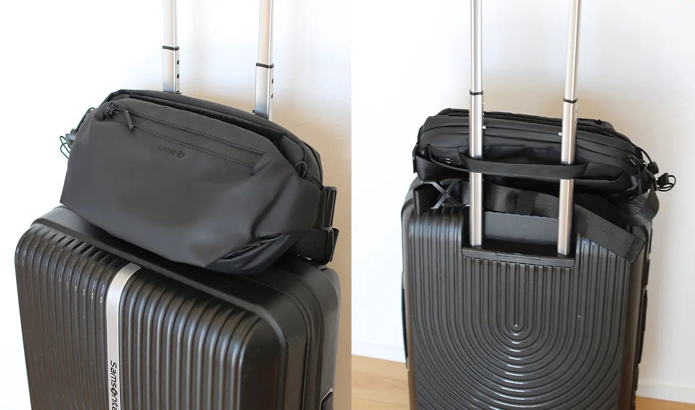 高機能の収納力と共に、「快適な持ち運び」設計も両立しました。人間工学に基づくように、身体にフィットするスリングバッグ形状を採用し、肩掛け・クロスボディの2WAYで使用可能。