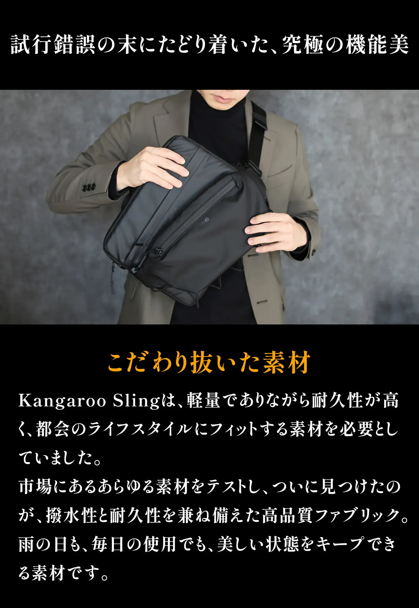 Kangaroo Sling は、見た目のスマートさだけでなく、バッグを変えずに長く愛用したい人にとってどんな環境でも安心して持ち運べる「頼れる相棒」です。