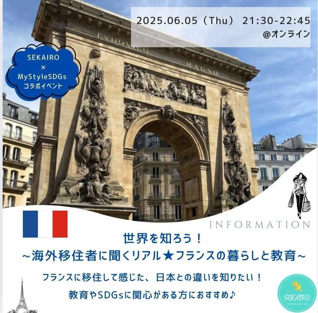 今回はフランス編として、現地在住者の視点から「教育」「SDGs」「移住」のリアルを届けるトークイベントをZoomで開催します。