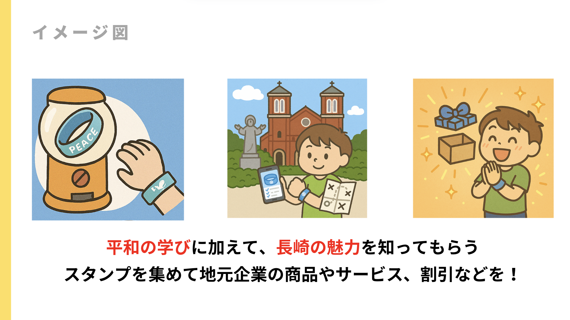 参加者は、市内各地の専用ガチャガチャからラバーバンドを手にして、QRコードからデジタルスタンプラリーに参加。長崎では平和公園、原爆資料館、浦上天主堂などのスポットを訪れながら、クイズや解説を通じて学びを深めます。
