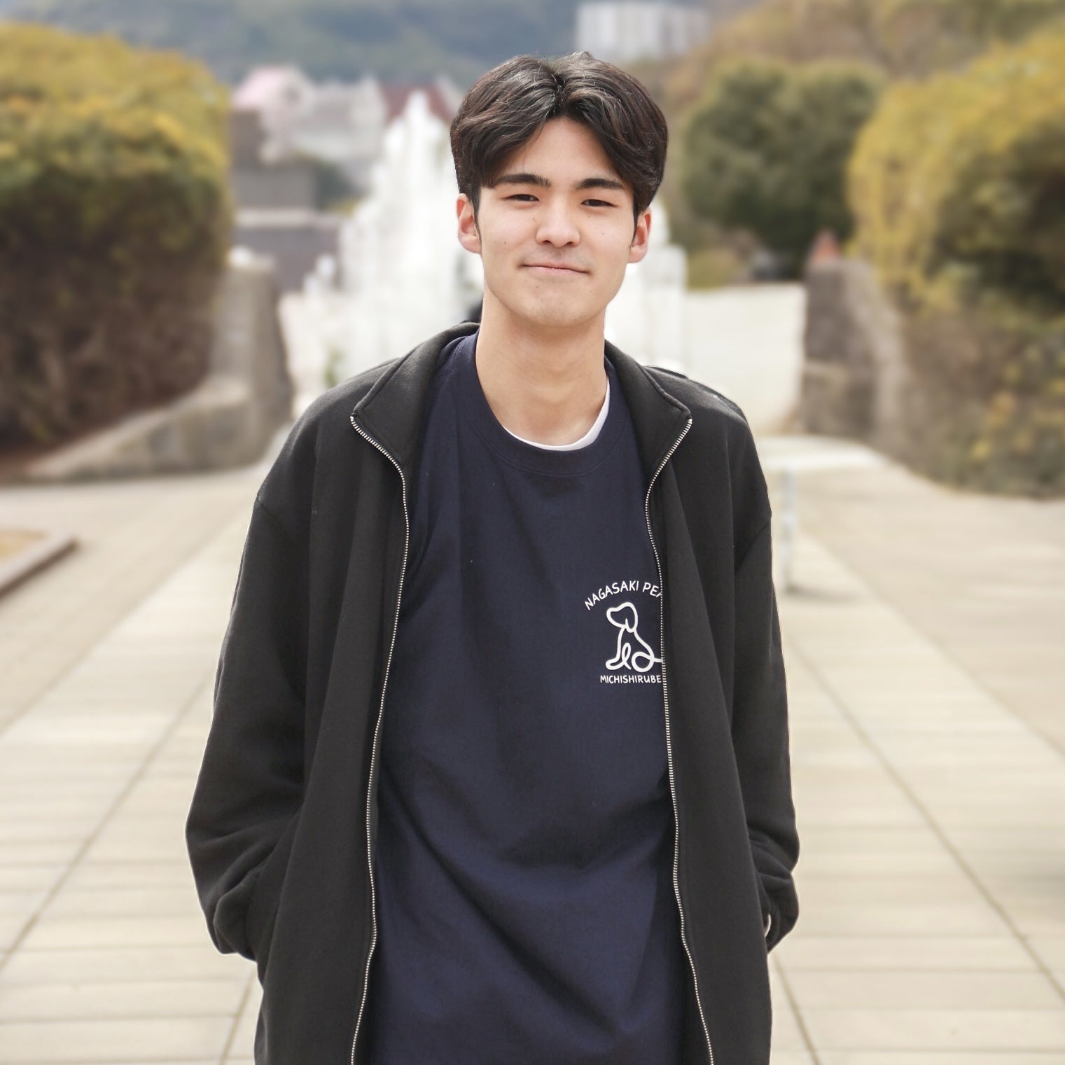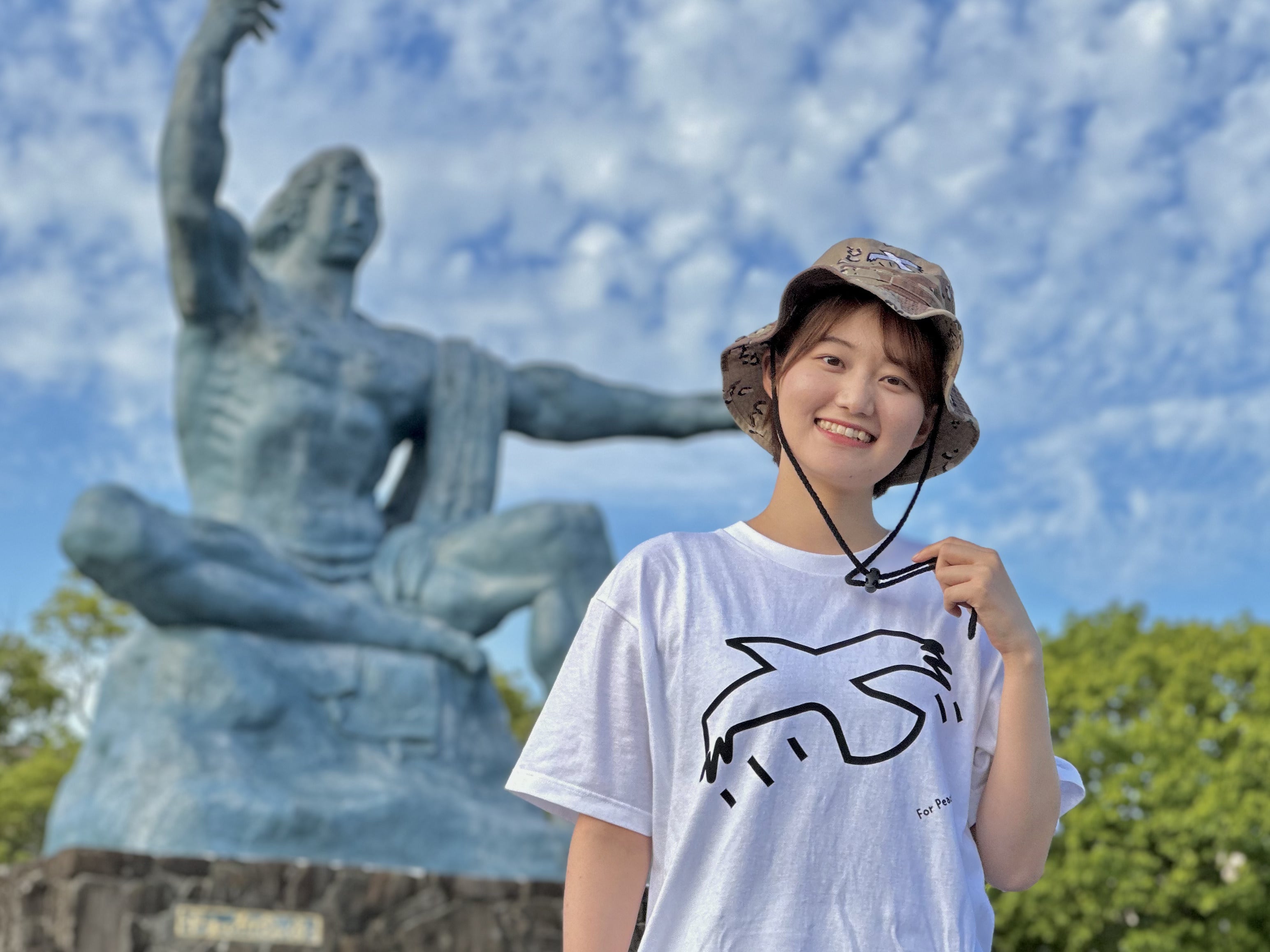 長崎の平和をファッションとして発信する「4PS NGS」のリーダーを務める、長崎県上五島出身で大学から長崎市内で平和活動に取り組む上田直樹(4PS NGS担当リーダー兼長崎ピースブランドリーダー)