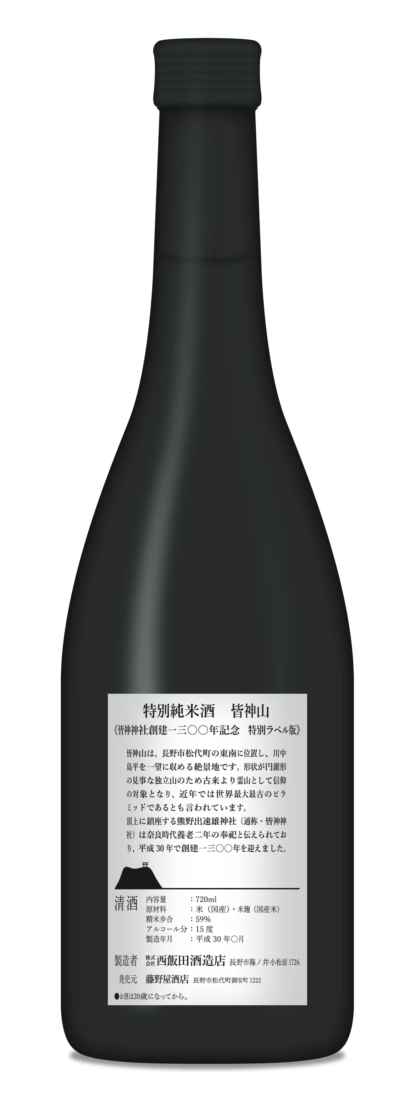 藤野屋酒店(松代町)、西飯田酒造店(篠ノ井)の協力を得て、純米酒「皆神山」の創建1300年記念ラベルを製作し、関係者等に配布予定。