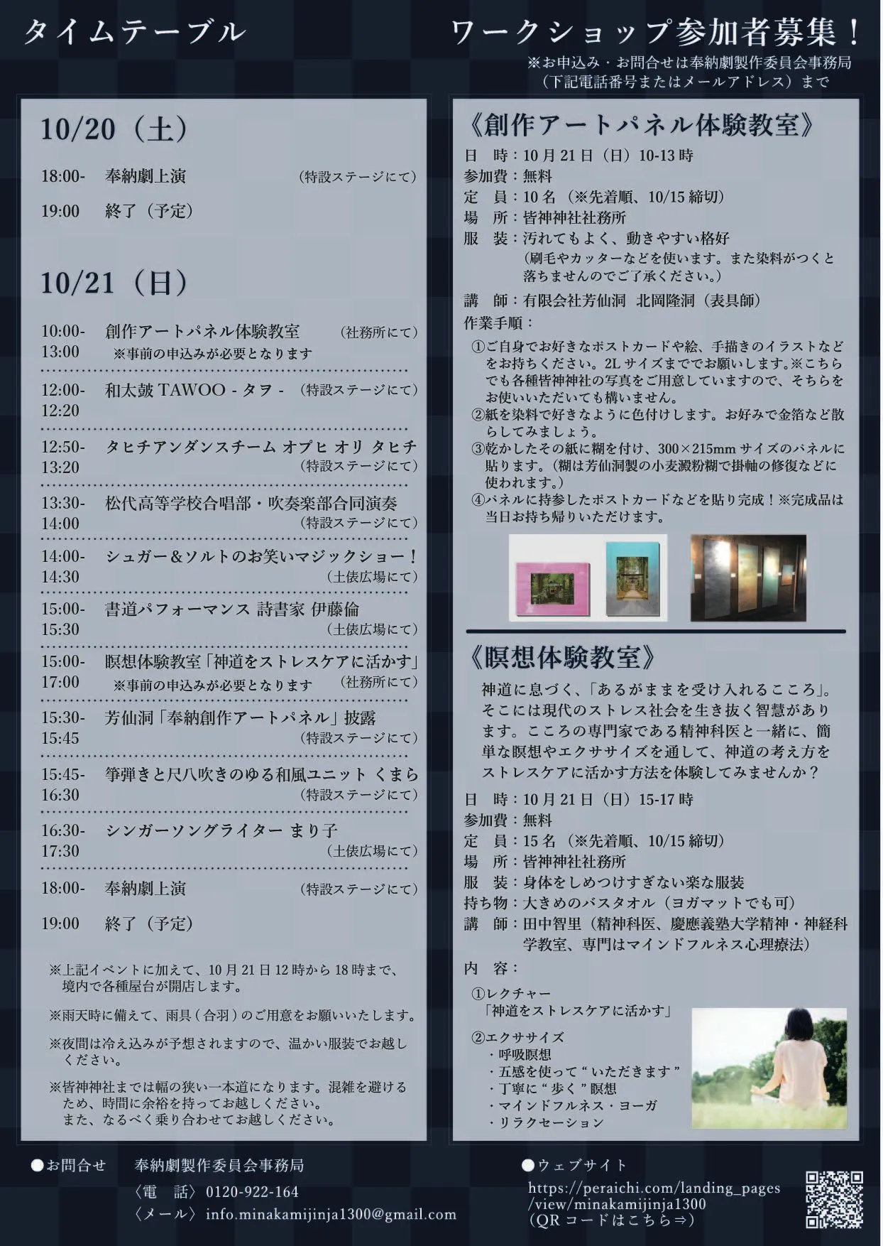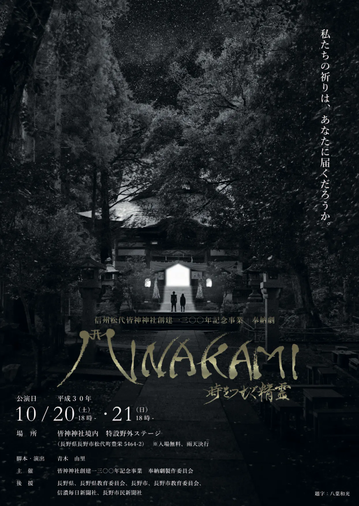 皆神神社1300年の歴史を物語として紡ぎなおし、神社や信仰の価値をひろく世に問うためのオリジナル演劇を製作。脚本・演出等は専門家に依頼し、出演者は地元から一般公募。