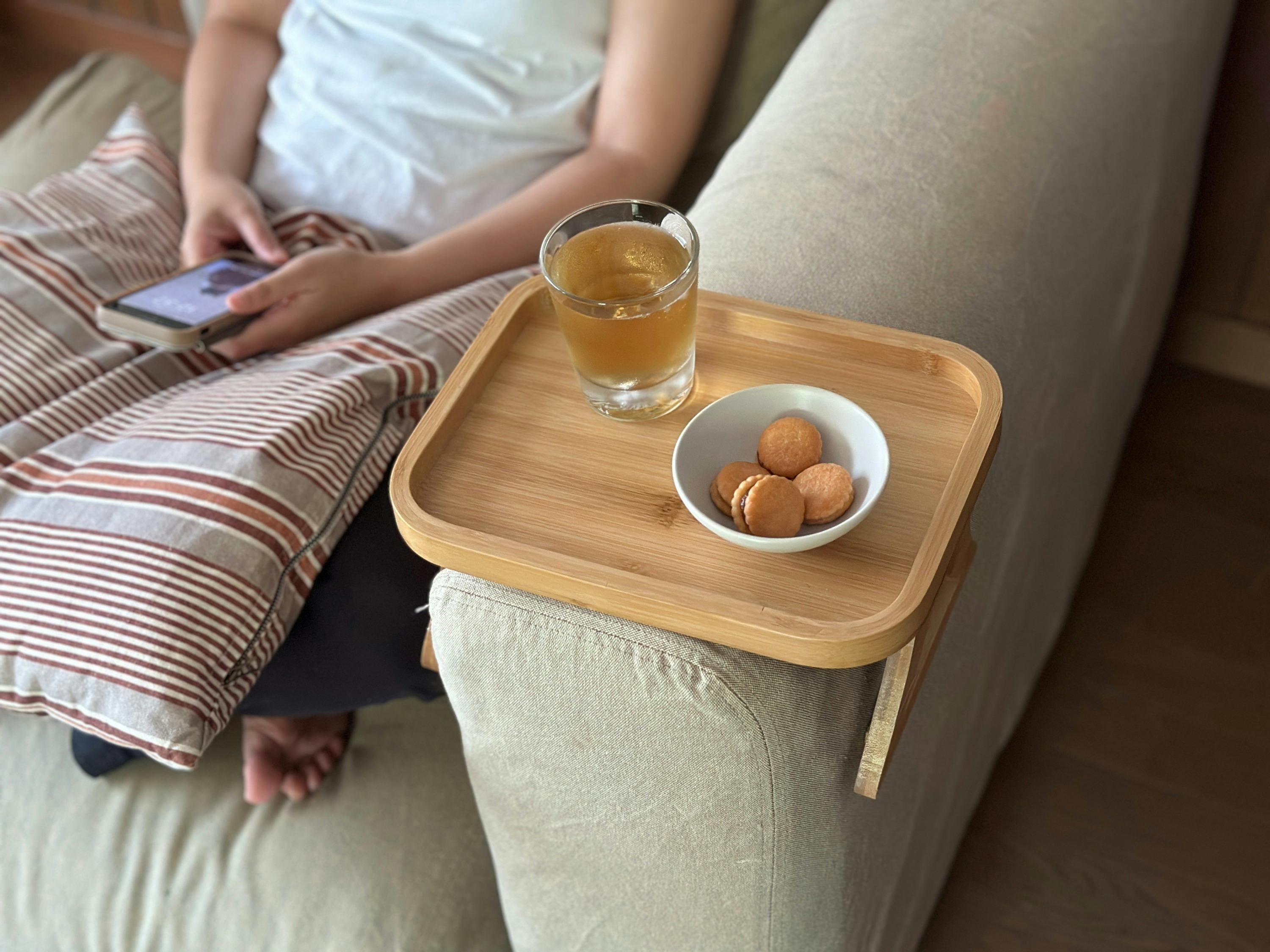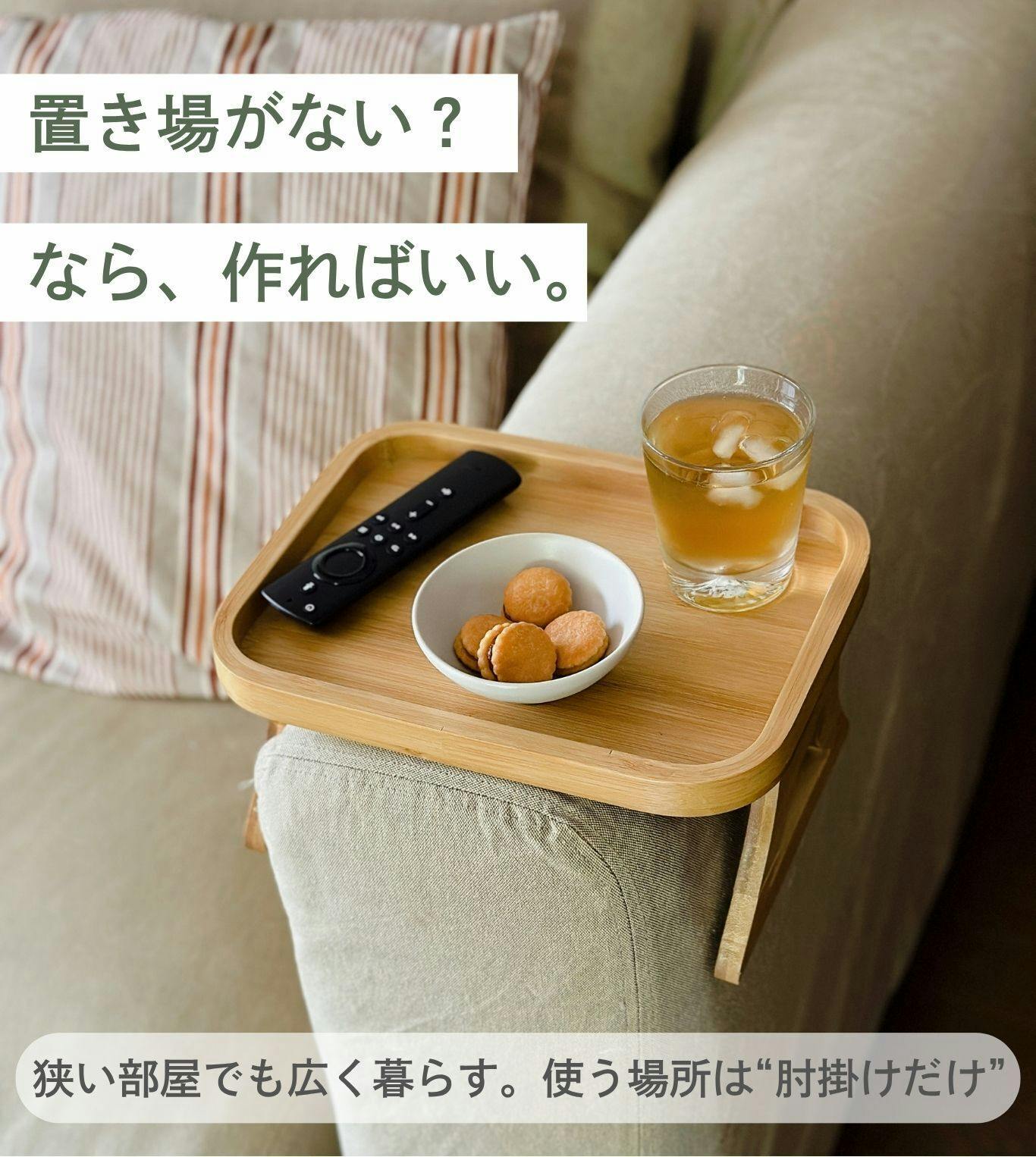 サイドテーブルを置くスペースがなくても、ドリンク・お菓子・スマホ・リモコンなどを手に届く場所に置くことができます。