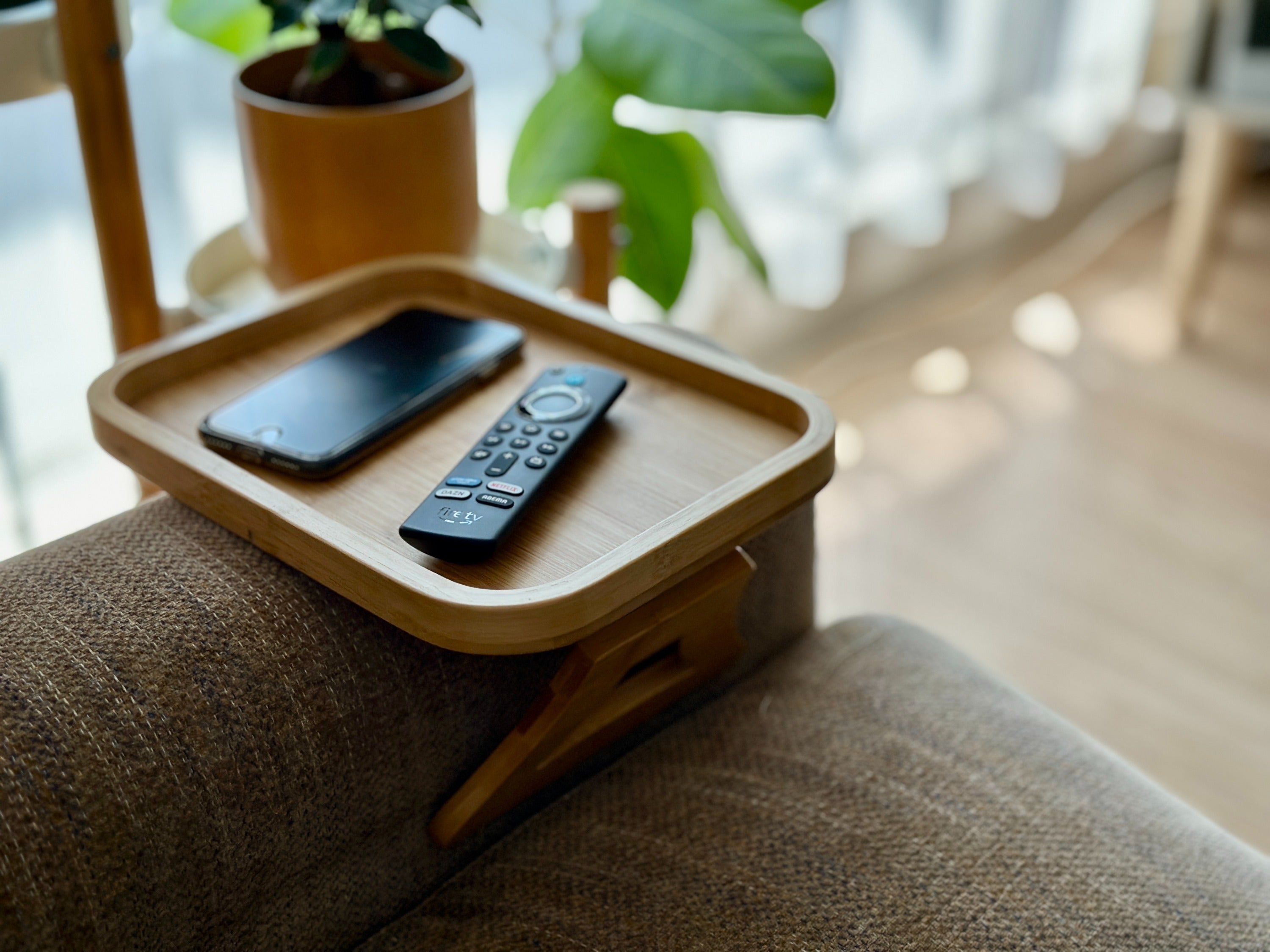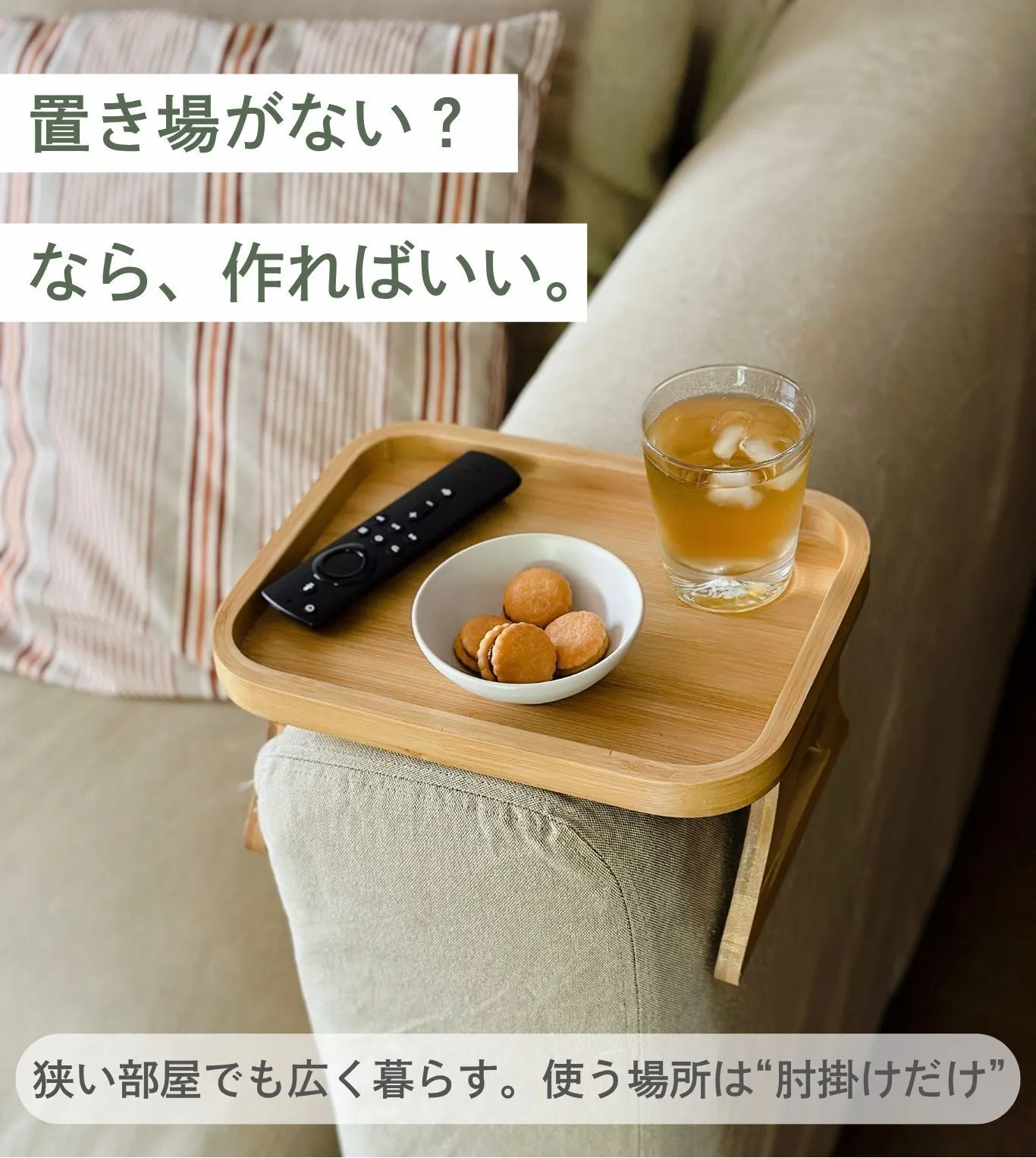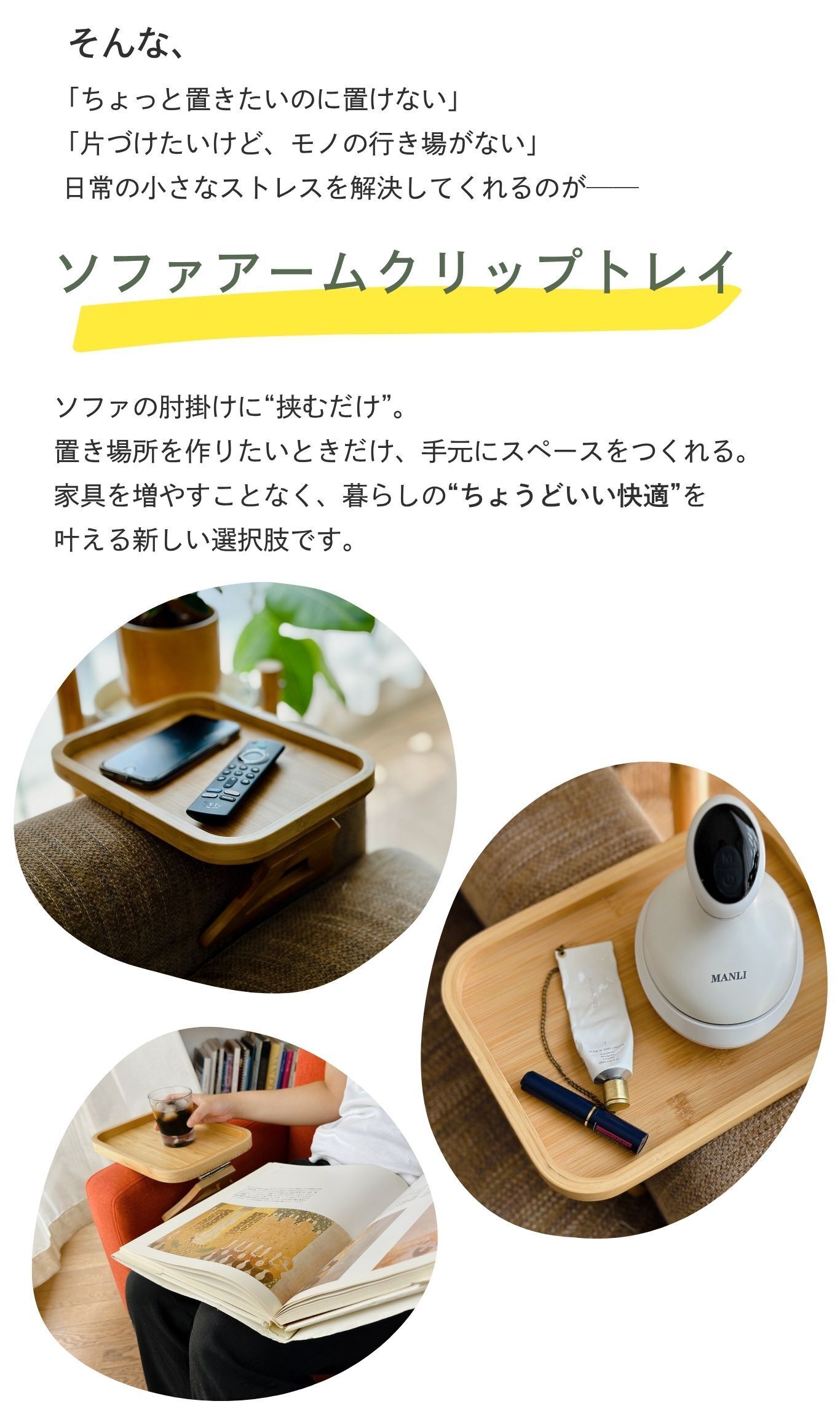『ソファアームクリップトレイ』は、ソファの肘掛けにクリップで簡単に固定できる省スペースなサイドテーブルです。座ったまま、スマホやマグ、リモコンなどを手元に置けることで、ソファ周りの“ムダな動き”を減らし、くつろぎ時間がより快適に。