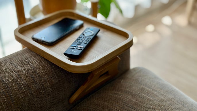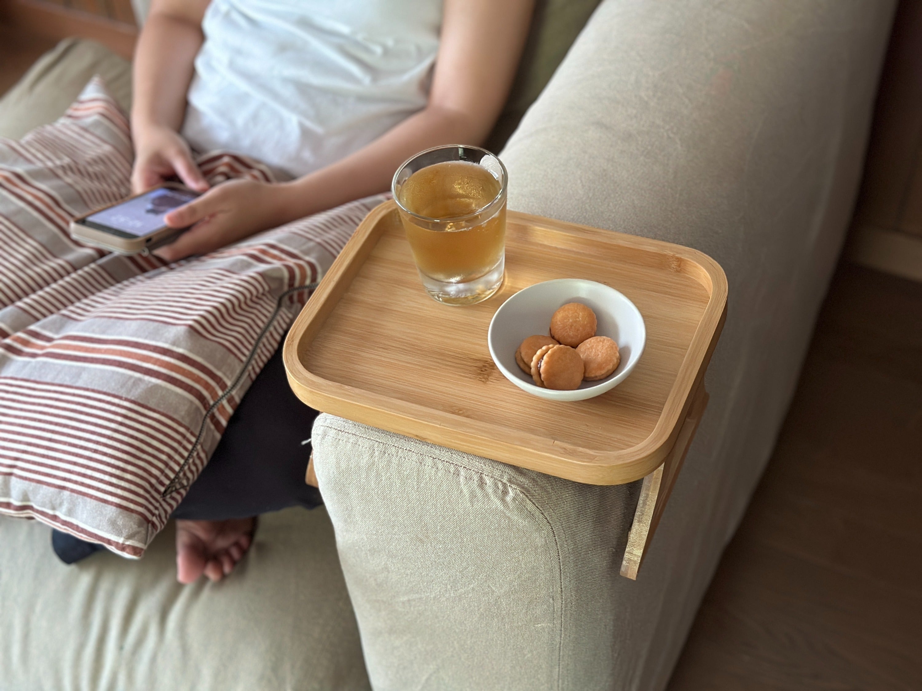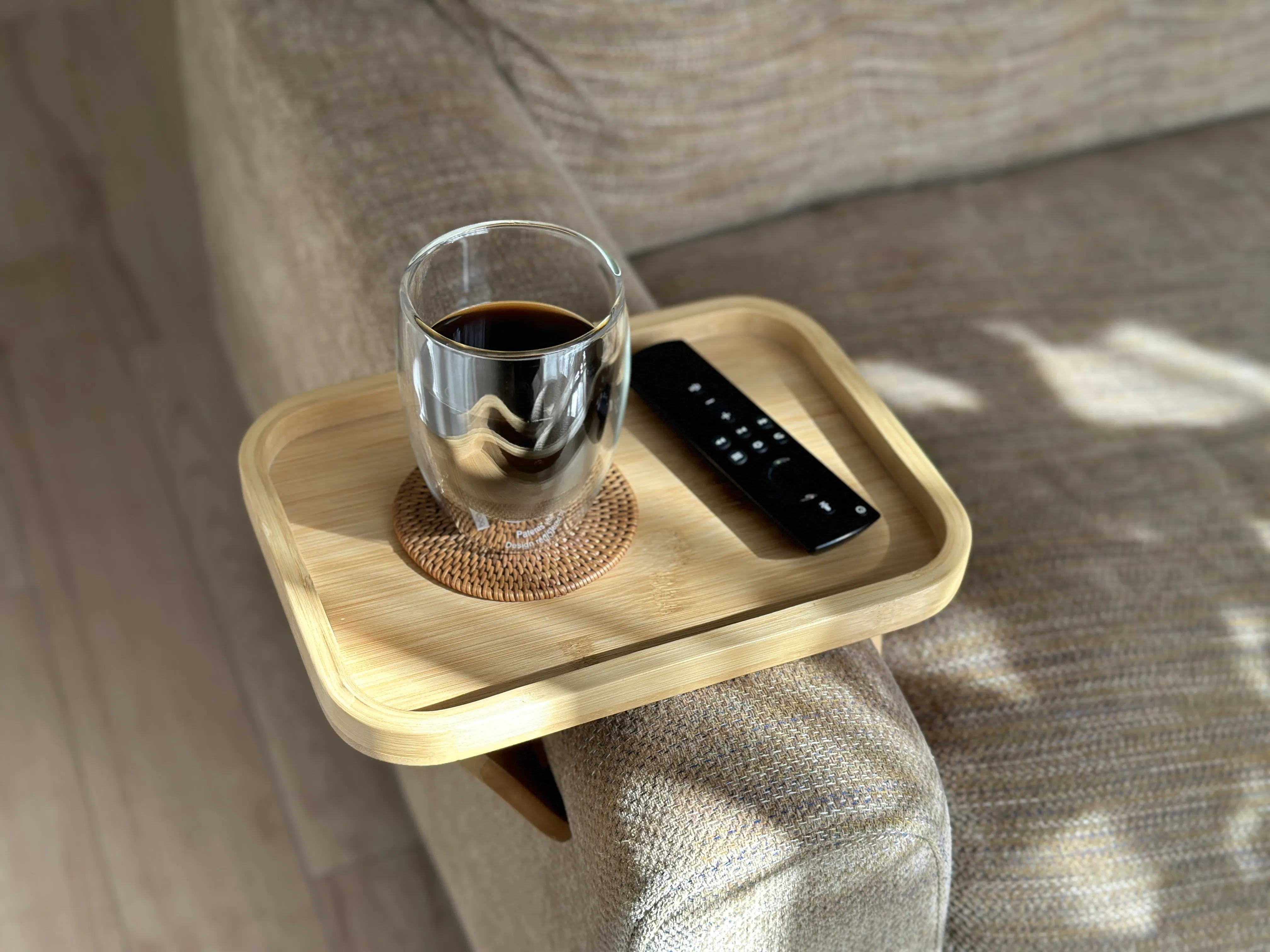 『ソファアームクリップトレイ』は、ソファの肘掛けにクリップで簡単に固定できる省スペースなサイドテーブルです。座ったまま、スマホやマグ、リモコンなどを手元に置けることで、ソファ周りの“ムダな動き”を減らし、くつろぎ時間がより快適に。
