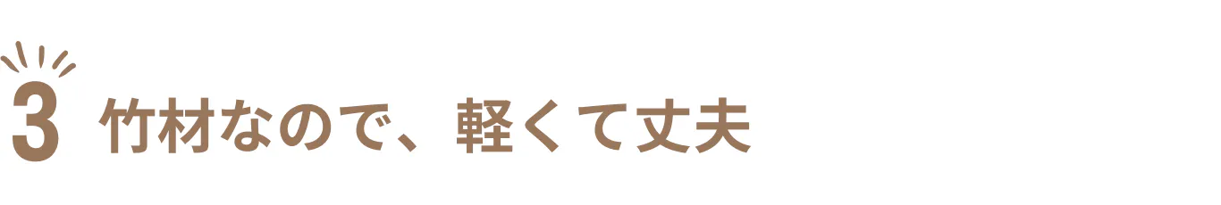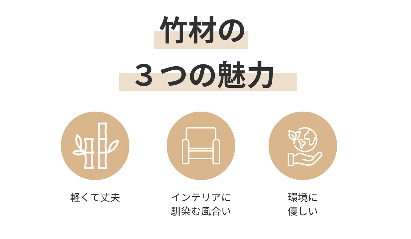 竹材は、軽くて丈夫な素材なので、日常使いにおすすめです。竹のナチュラルな質感と色合いは、インテリアにも自然に溶け込み、空間に温かみをプラスしてくれます。また、成長が非常に早く、短期間で再生産可能なため、持続可能な資源として注目されています。さらに、大量の二酸化炭素を吸収し、酸素を放出することで、地球温暖化の抑制にも貢献する環境に優しい素材です。