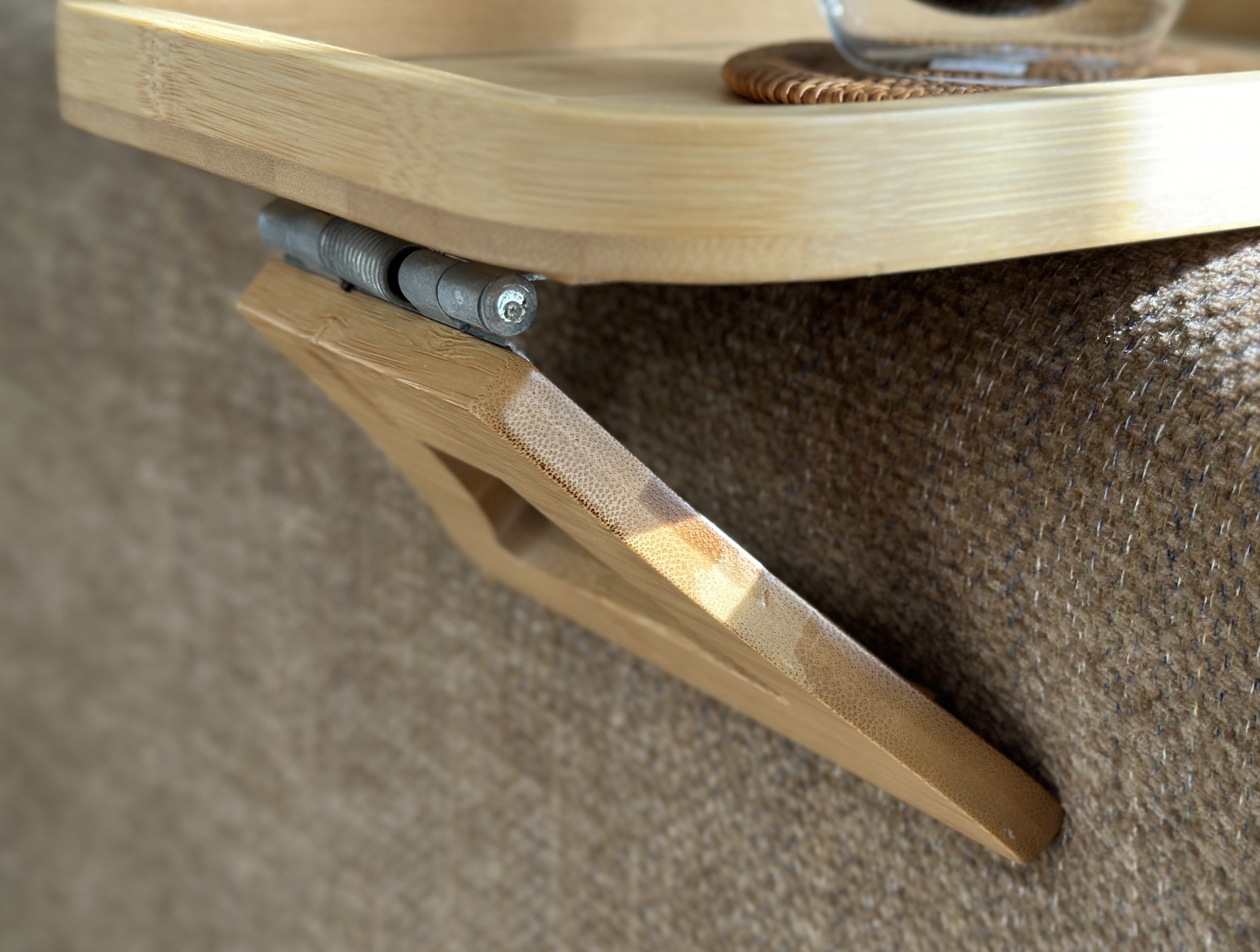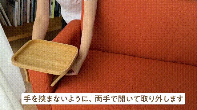 ソファのアーム部分を挟むだけ。バネ付きクリップがテーブルを安定させます。クリップで挟むことができれば、ほとんどのソファに使えます。