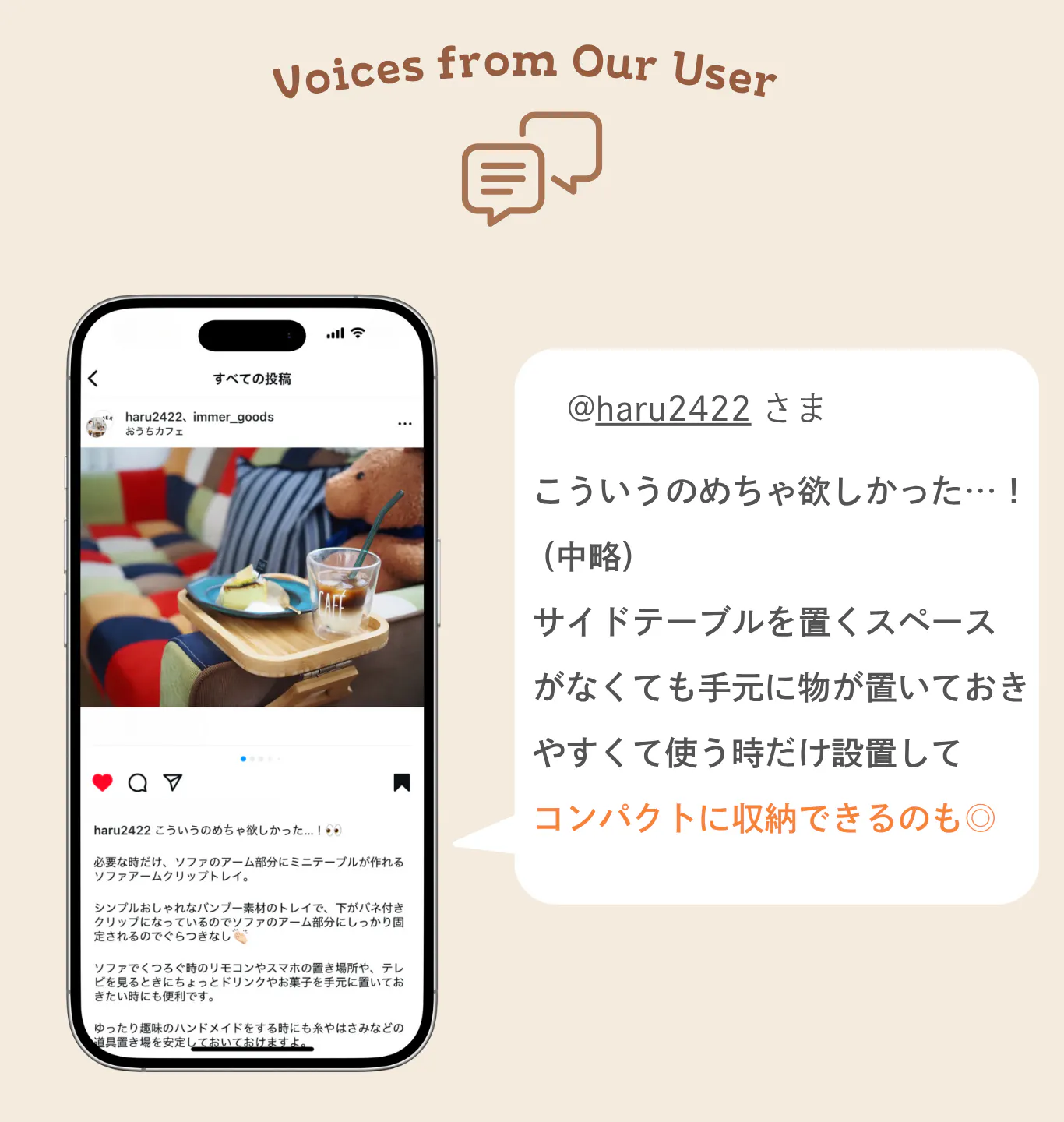 2025/08/30 19:30いよいよ残り1日となりました。ここまでご支援くださった皆さま、本当にありがとうございます!本日はソファアームクリップトレイの魅力が分かる投稿をご紹介します。▼投稿はこちらhttps://www.instagram.com/reel/DAC2i65qRtK/?igsh=Mm5zMDkxbzF2MW1tつくもはる様(@haru2422)が、こういうのめちゃほしかった…!と、ソファアームクリップトレイの魅力を紹介してくださいました。ぜひこちらの投稿を参考に、検討していただければ嬉しいです! もっと見る