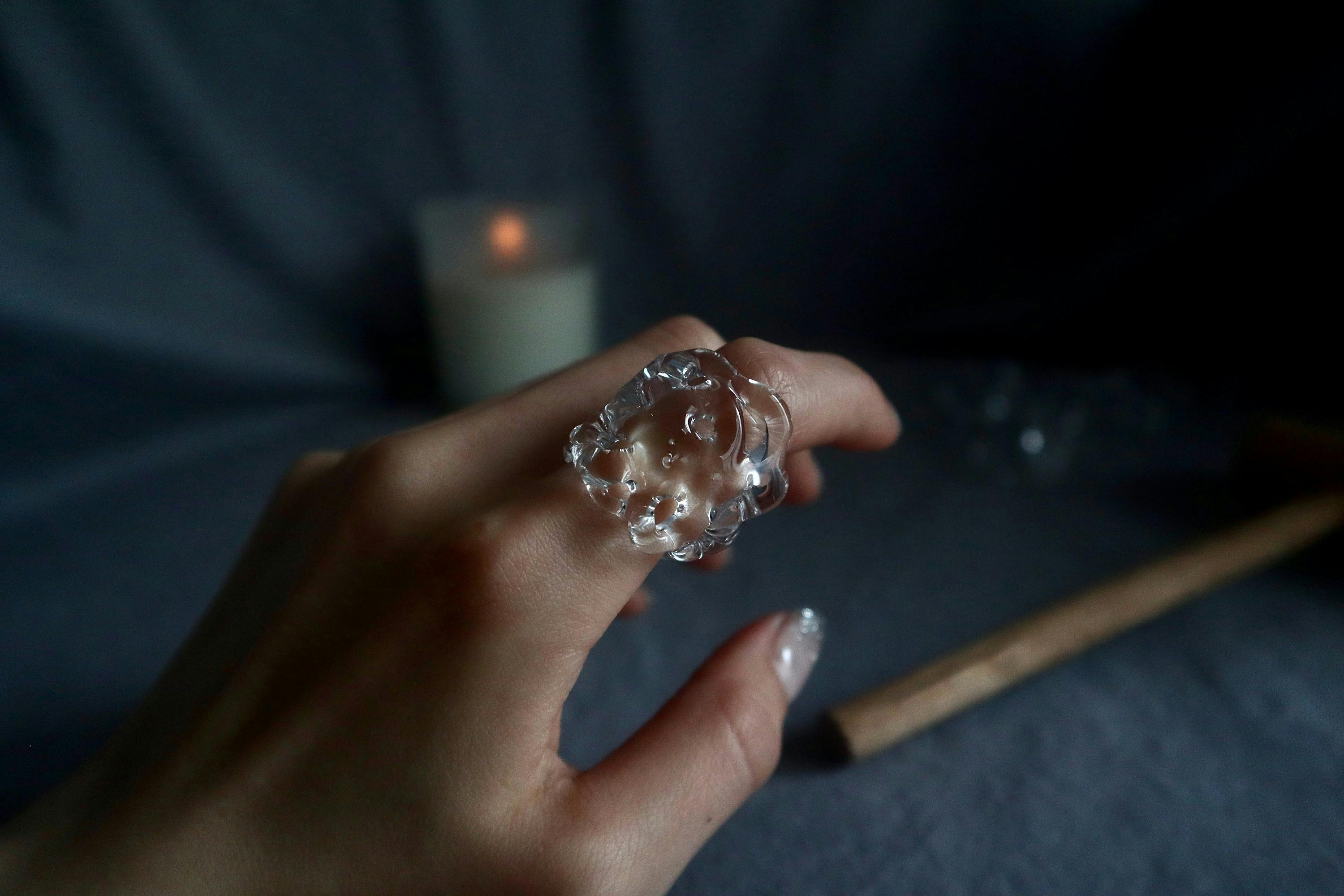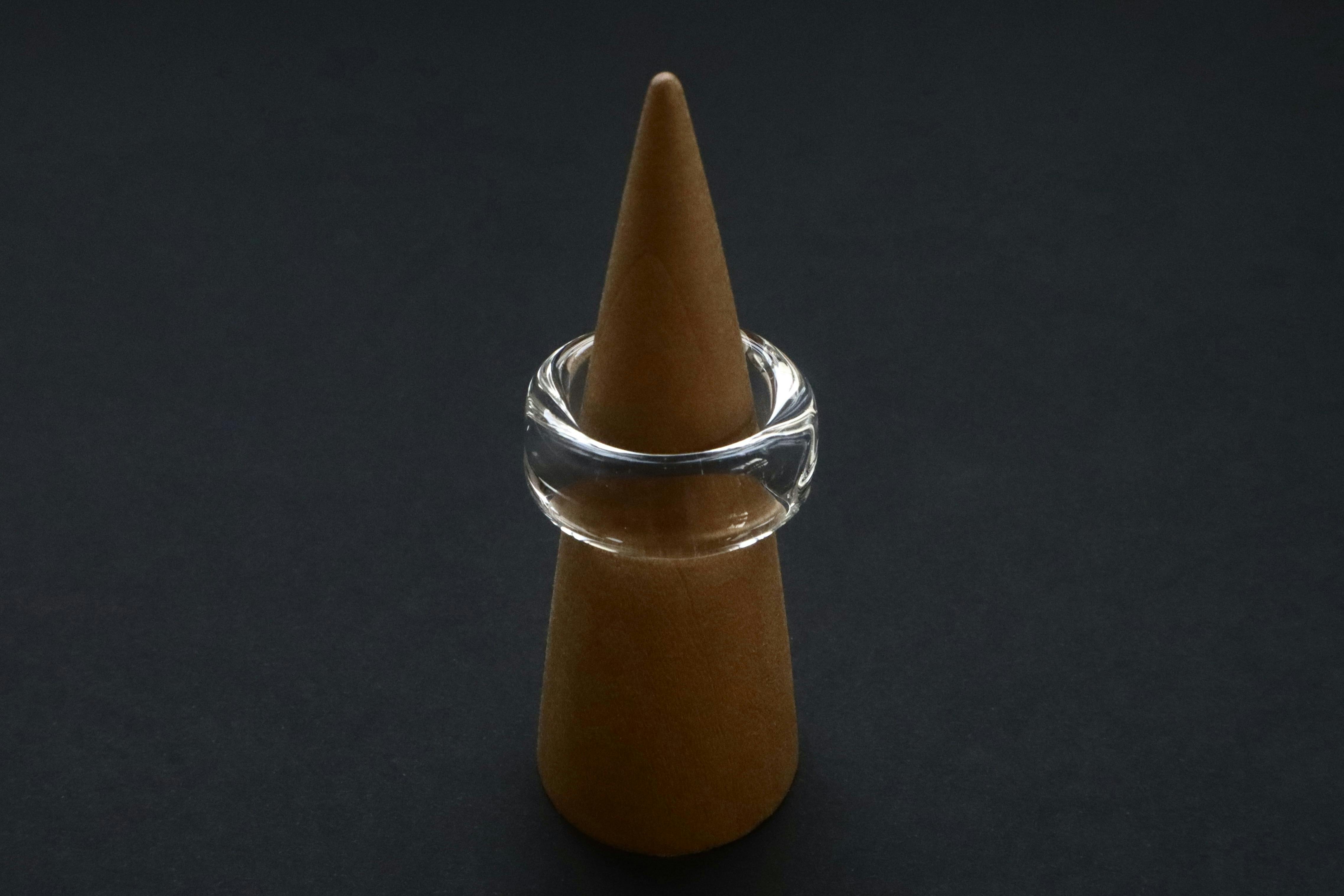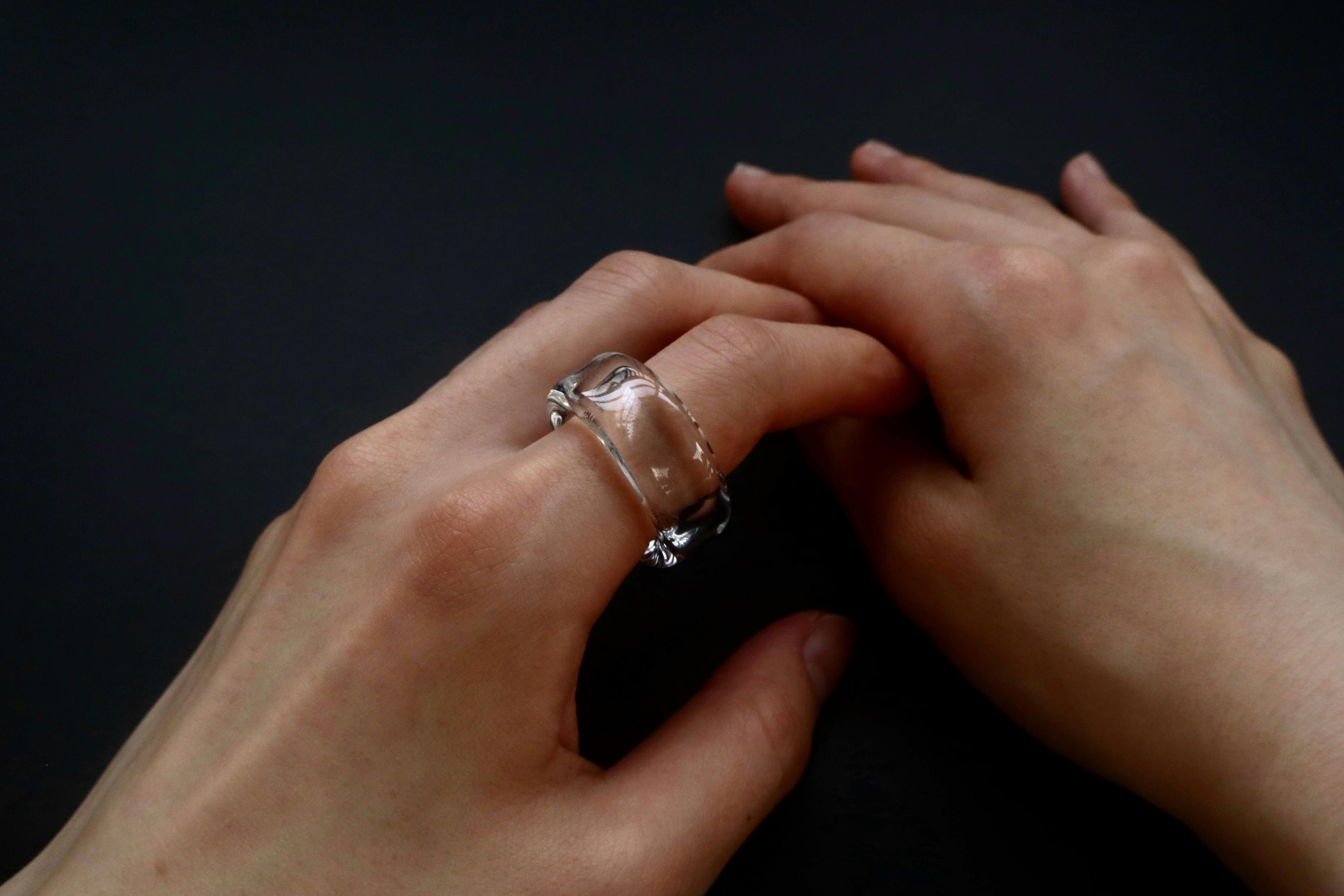 このガラスを使用した指輪は、まるで指に水をまとったかのような印象を放ちます。
