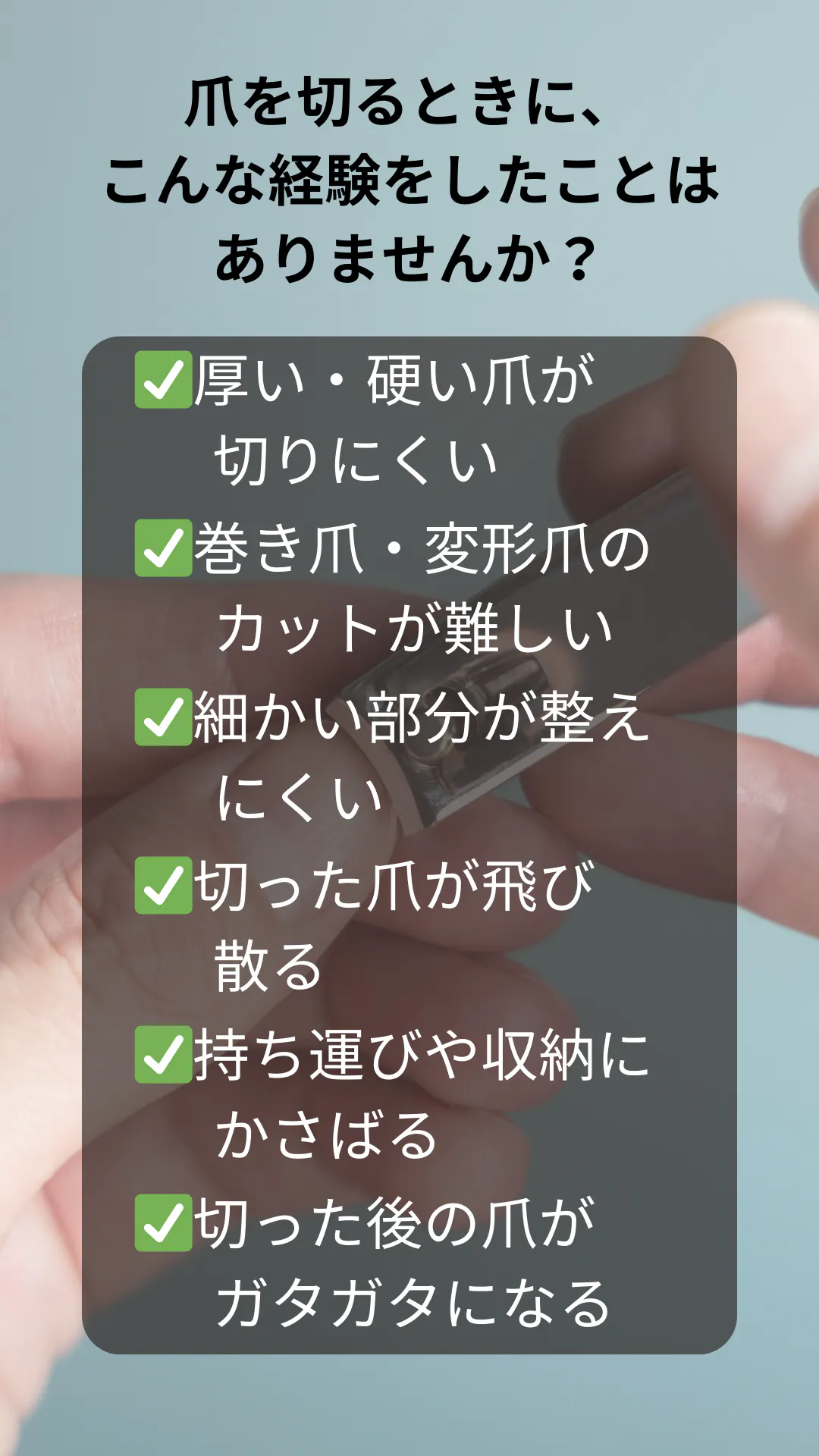 爪切りもそのひとつです。持ちにくい、切りづらい、爪が飛び散る……小さな不満が積み重なることで、いつの間にかストレスになっていることも。そこで私たちは、「もっと快適に、もっとスマートに使える爪切りがあったら」と考え、このプロジェクトを立ち上げました。