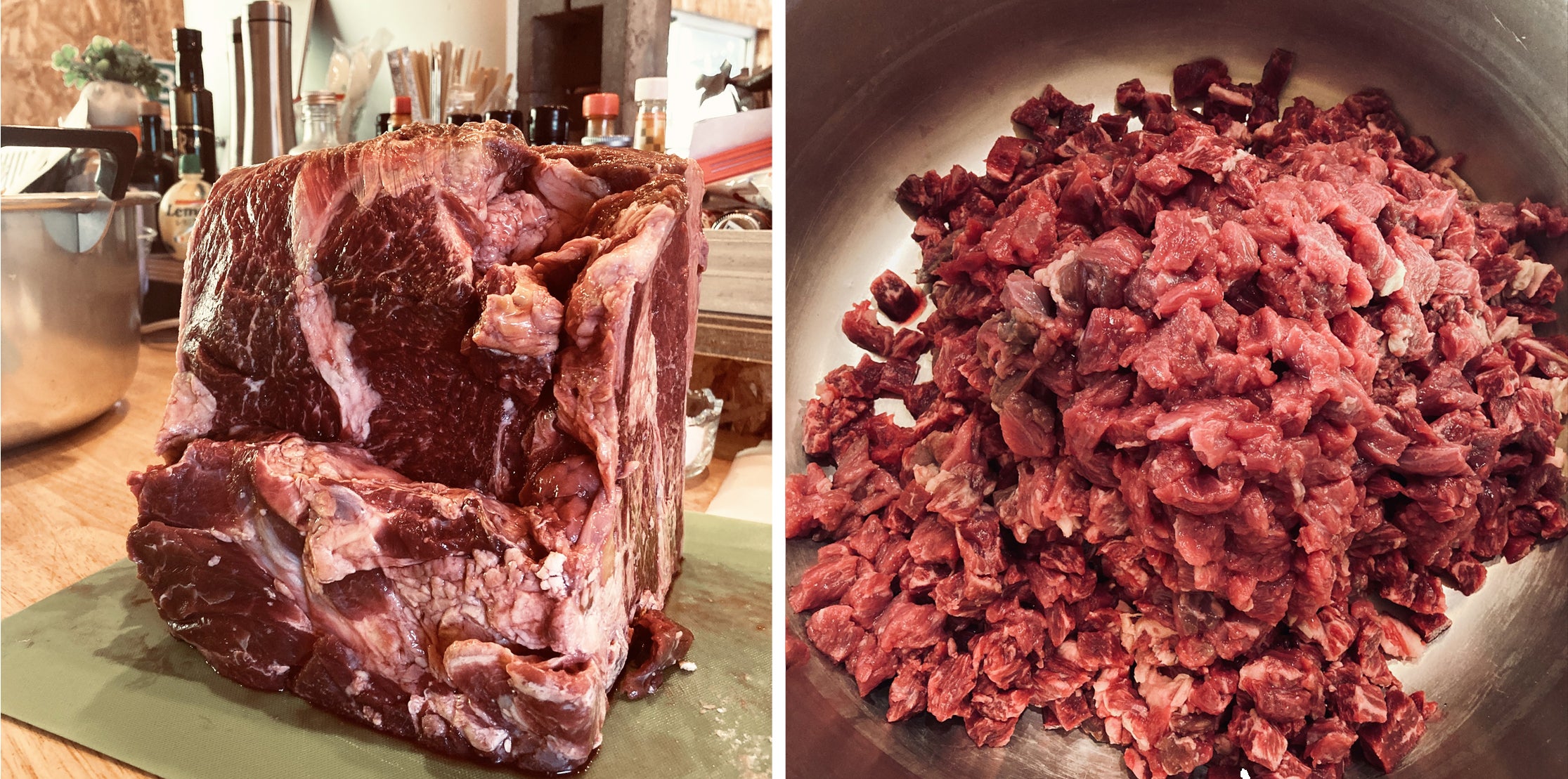 試作のバンズで作ってみた試作のバーガーそうは言ったものの、何から始めたら良いのか全く分からぬまま「聞く前に実践!」と思っているので、まずは肉をの塊を購入し(本物に近づくためには同様のことをしなければならない)、youtubeを見て、見よう見まねで捌き、友人のパン屋さんに頼んで試作用のバンズを作ってもらい、ソースも市販のソースなどを調合し、素人のままごとのようなハンバーガーからこのハンバーガーはスタートしました。