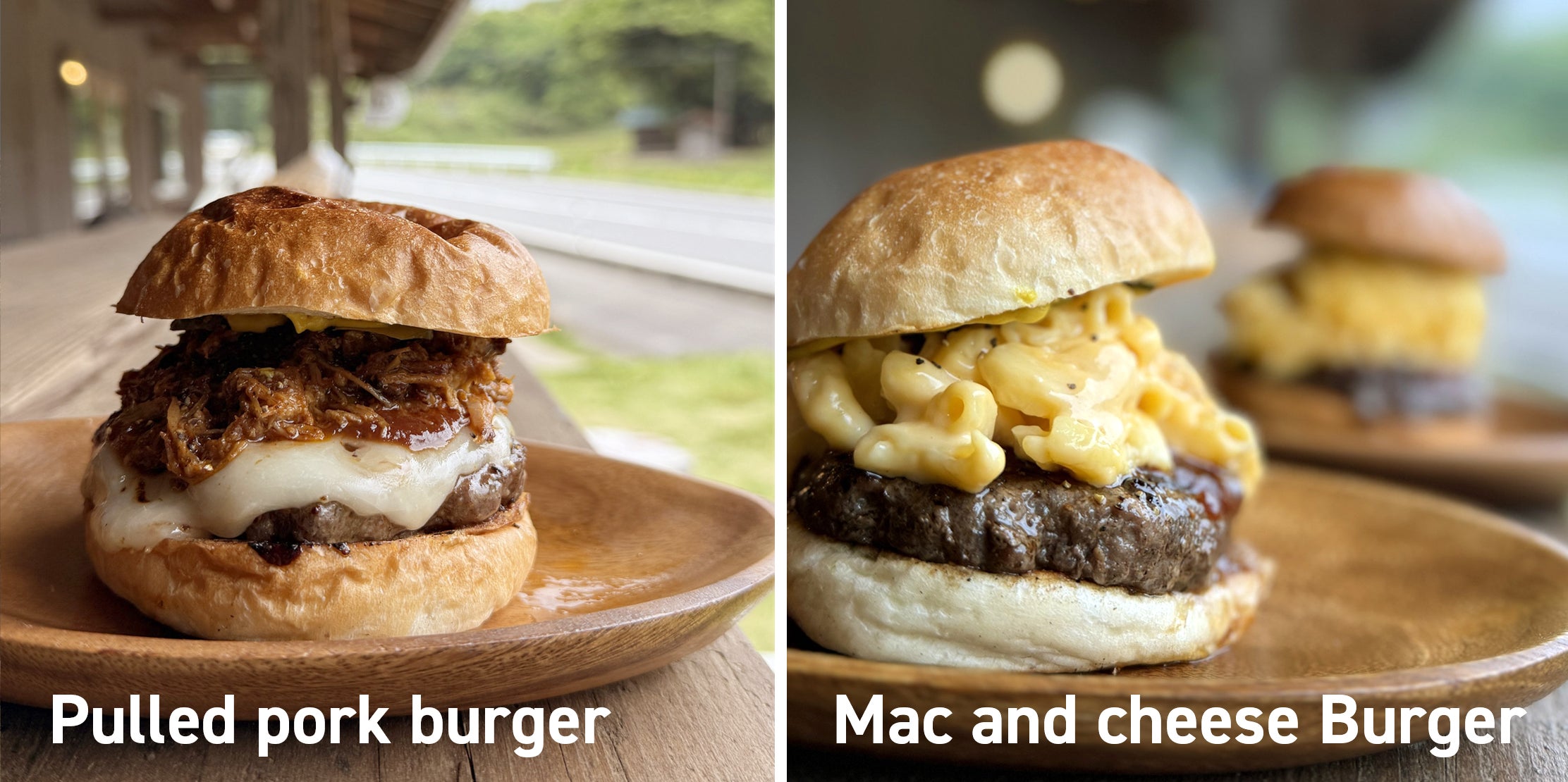 左:プルドポークバーガー(豚の肩ロースを煮込んでフレーク状にしたもの)