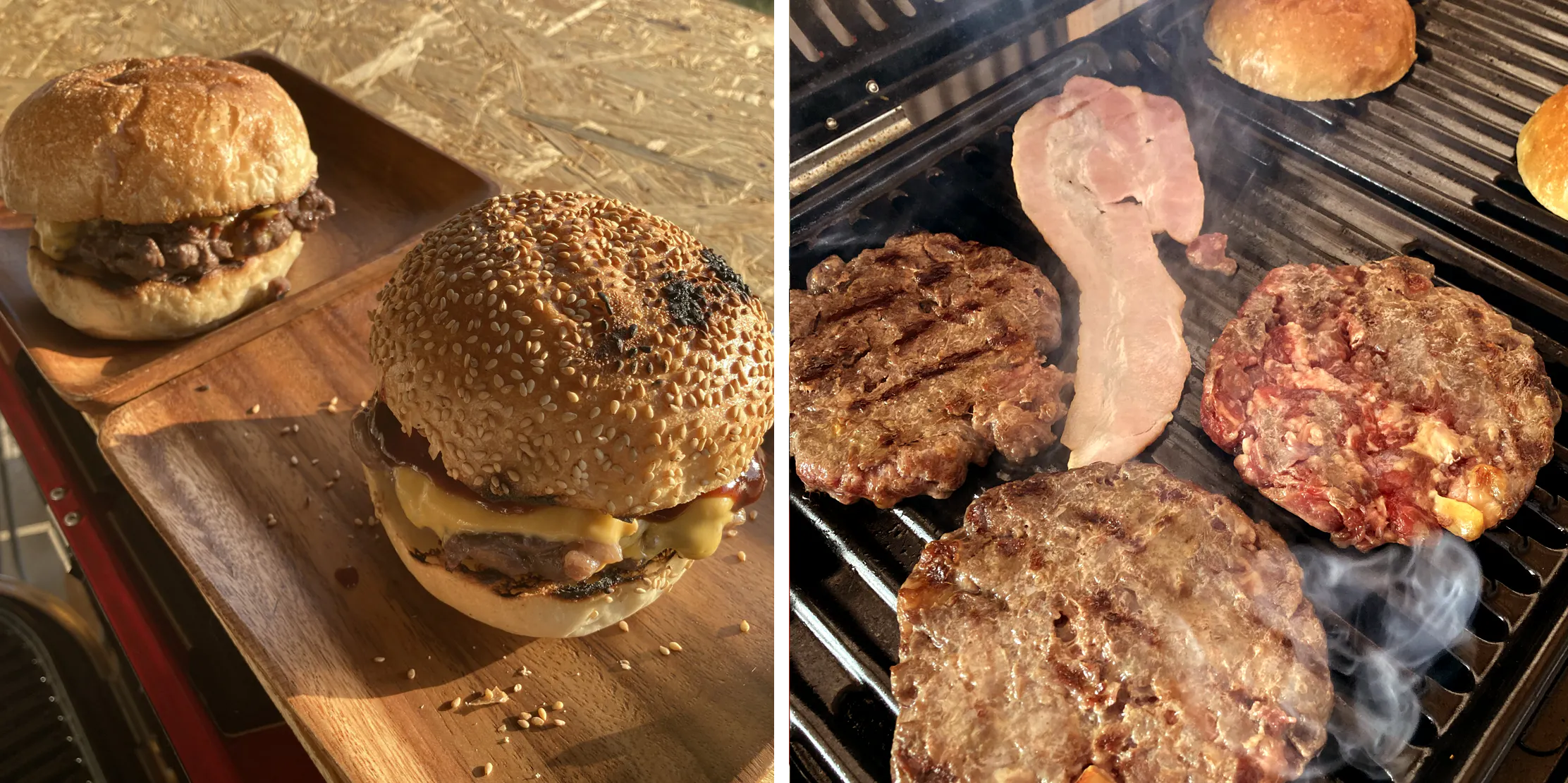 初めて作ったハンバーガーとハンバーガーを作る後ろ姿