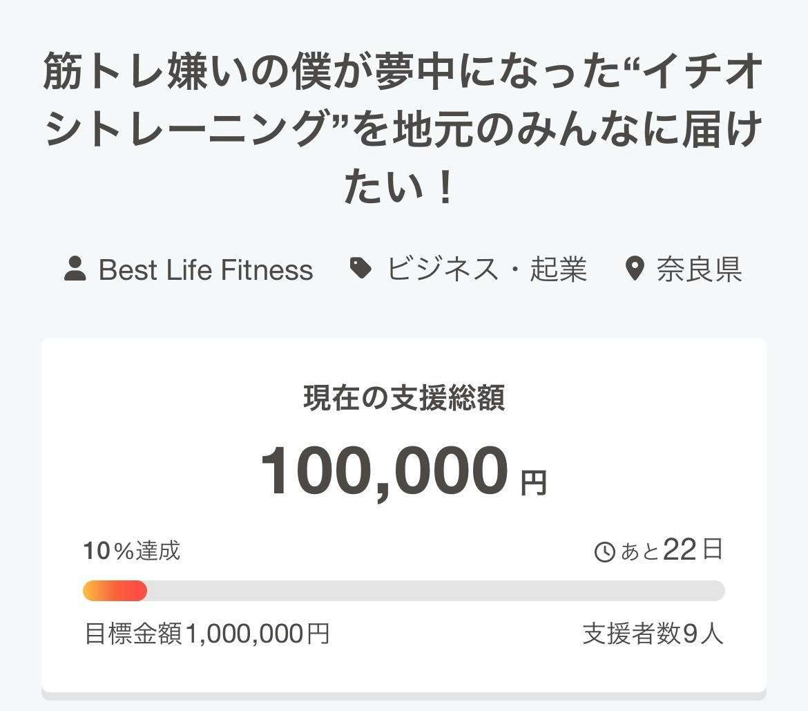 2025/06/23 09:23クラウドファンディング3日目が終了しました。ご支援いただいた方々本当にありがとうございます。只今10%まで達成しております!リターンは準備が整い次第お渡ししますので今しばらくお待ちください。まだ終了まで20日程残っています。最後まで諦めずに頑張りますので引き続き応援やシェアをお願いいたします。Best Life Fitness井阪 元 もっと見る