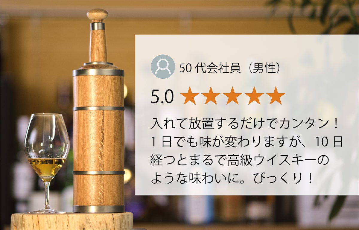 A:使うたびに違った熟成の仕方をしていきます。木の香りが強く出る初回から、回数を重ねるごとに本物の樽熟成のような穏やかな味わいに変わっていきます。