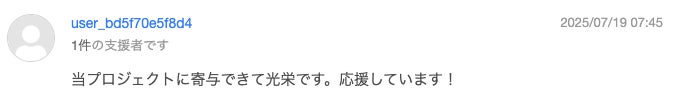 プロジェクトをご支援いただきありがとうございます!こちらこそ応援いただき、光栄でございます。。。!