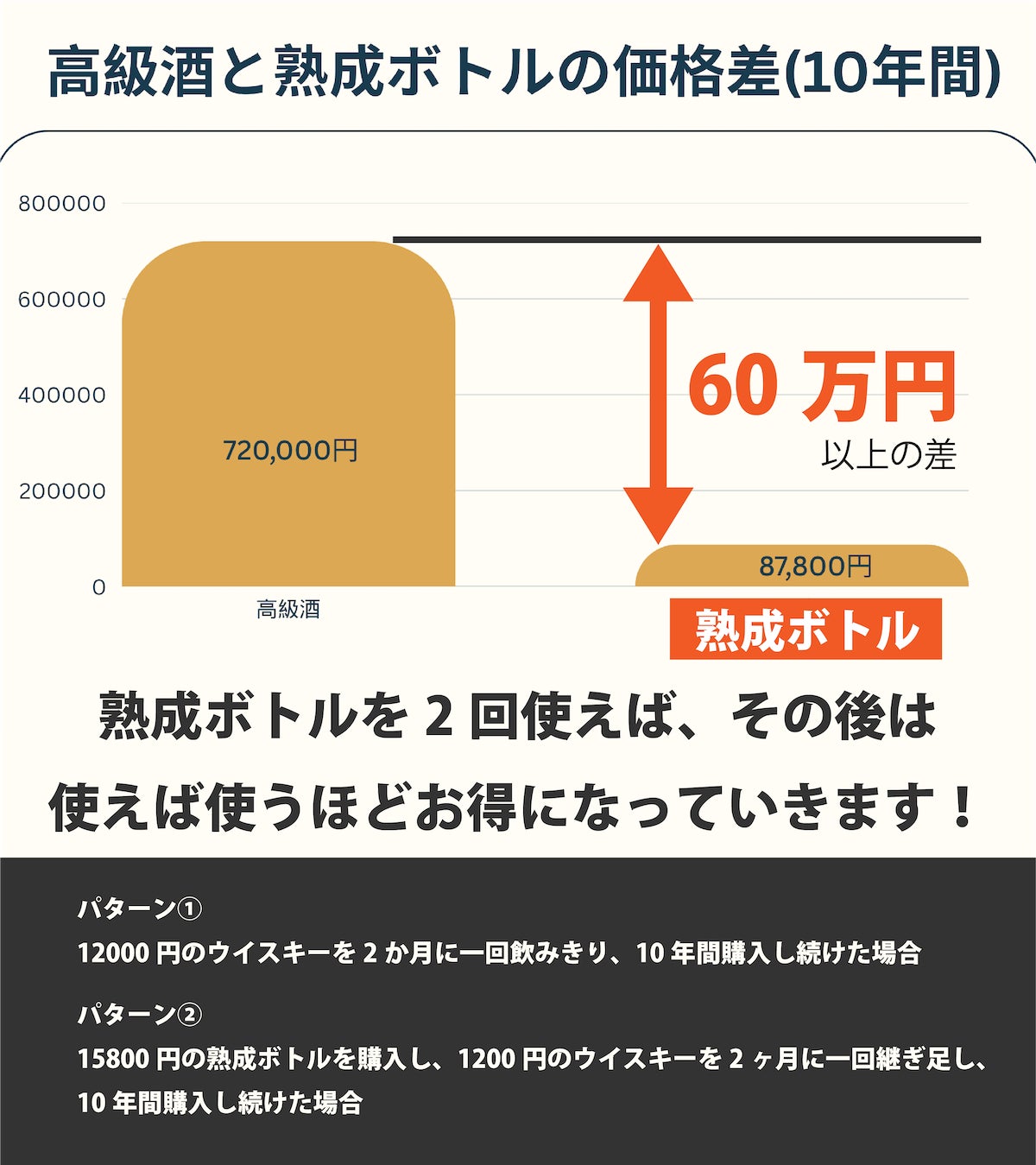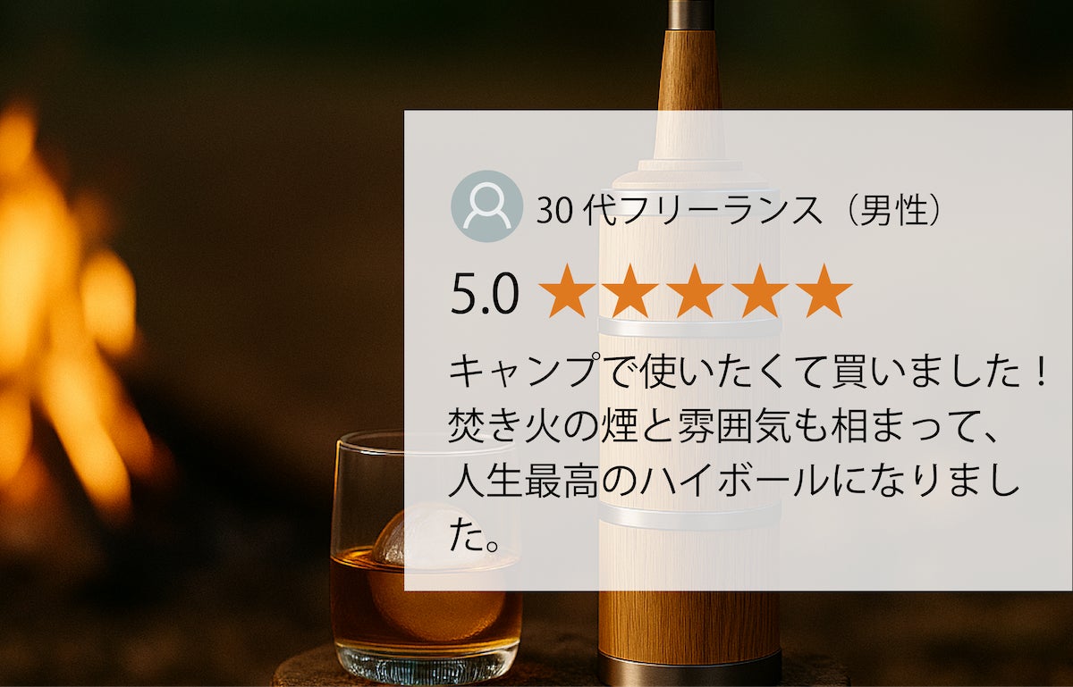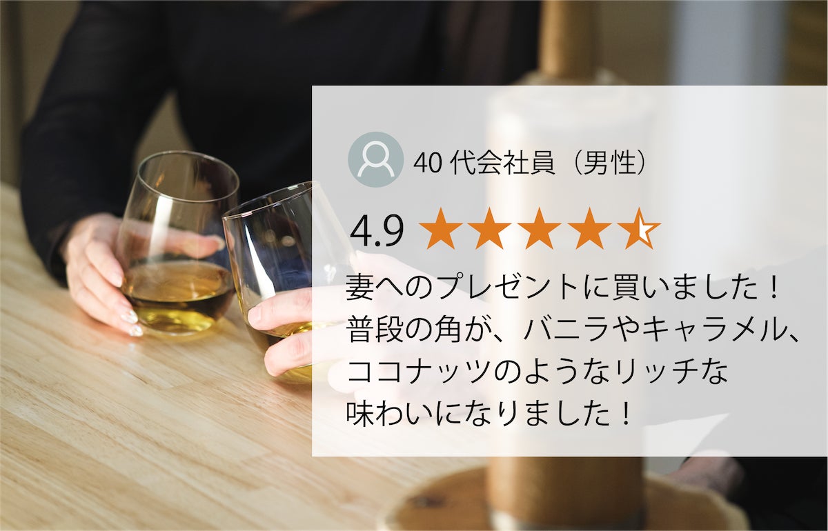 A:使うたびに違った熟成の仕方をしていきます。木の香りが強く出る初回から、回数を重ねるごとに本物の樽熟成のような穏やかな味わいに変わっていきます。