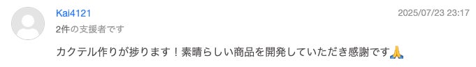 こんばんは!ゴールデンハイボールのリナまるです!カクテル作り、素敵ですね。。。嬉しいお言葉までありがとうございます!