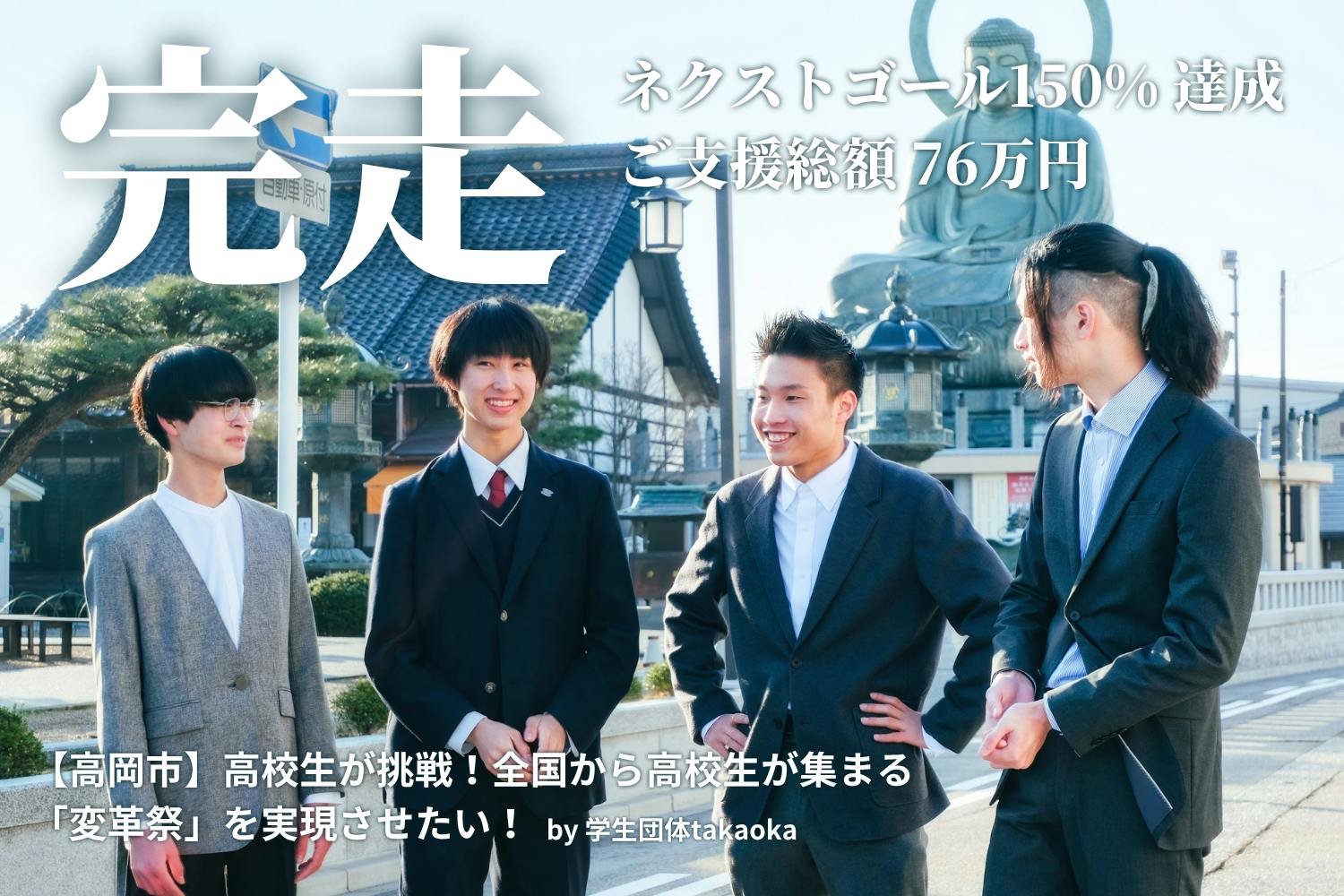 学生団体takaoka代表の油谷です。本日0:00をもって、「変革祭」クラウドファンディングは76万1,000円のご支援を集め、無事終了となりました。