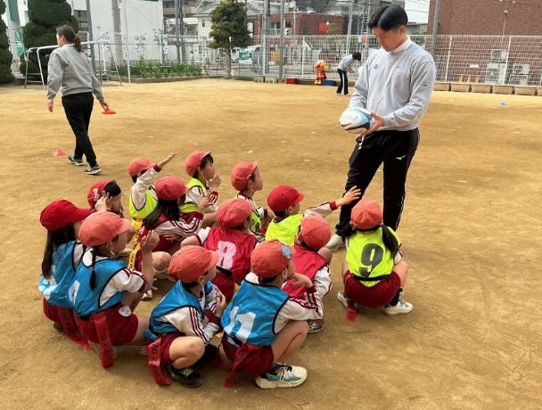 園庭いっぱいに元気な声が広がり、ラグビーを楽しむ子どもたちの姿がとても印象的でした。