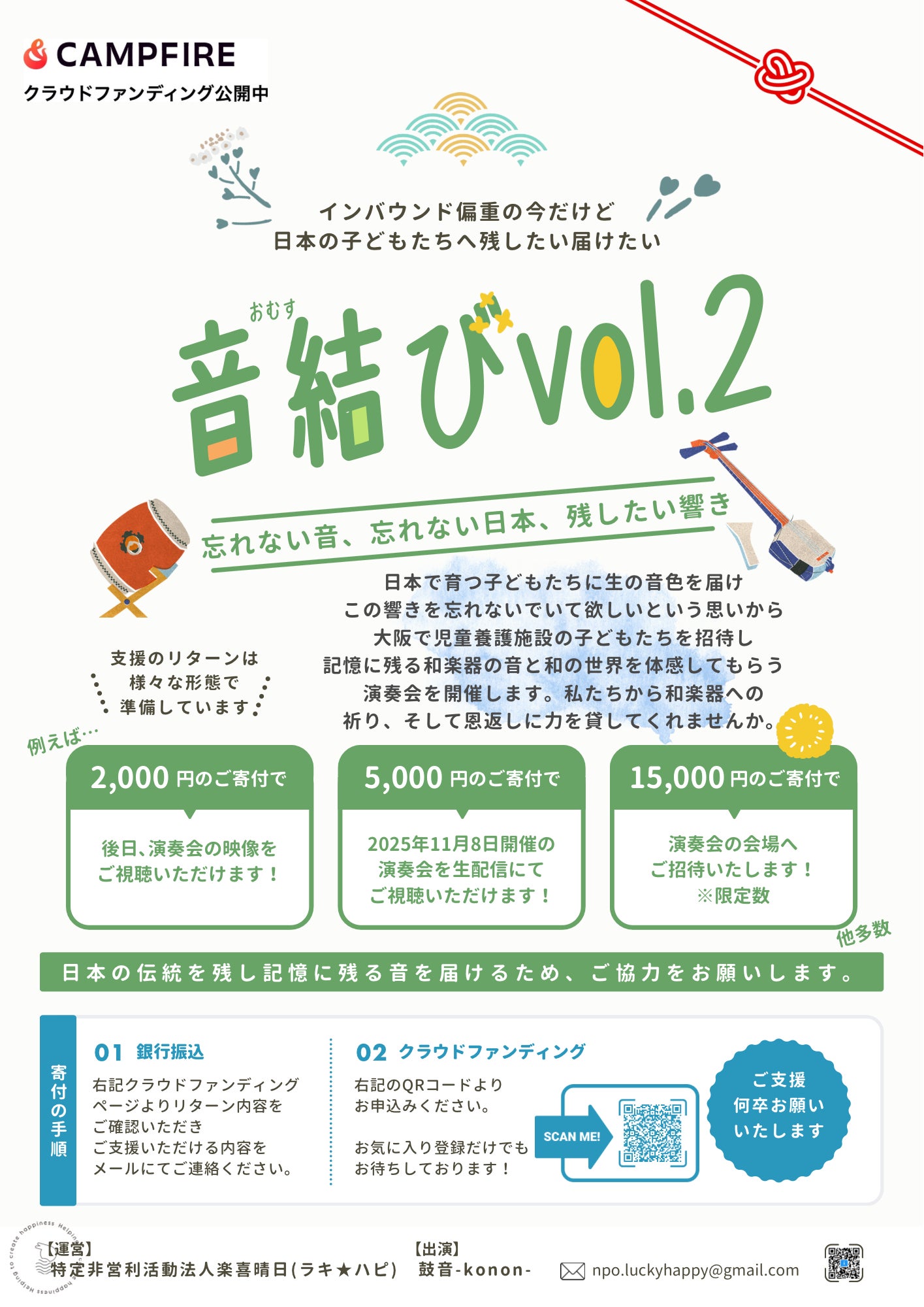 インバウンド偏重の今、未来を担う子どもたちに本物の音を届け、まず体感し忘れないでいて欲しいという思いから2025年11月、大阪で児童養護施設の子どもたちを無料招待し、記憶に残る和楽器の音と和の世界を体感してもらう演奏会の資金を集めたい。私たちからの和楽器への恩返しです。