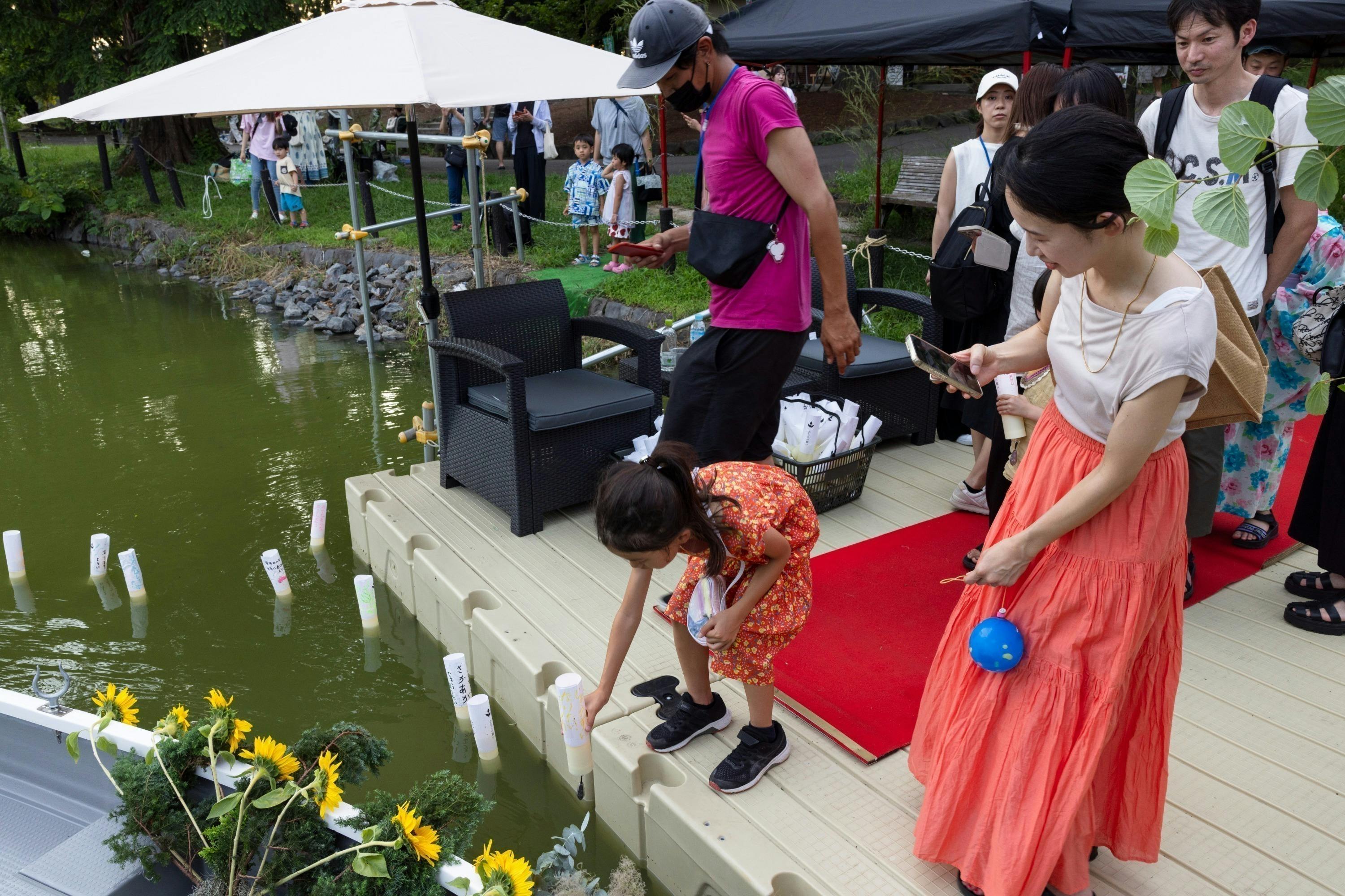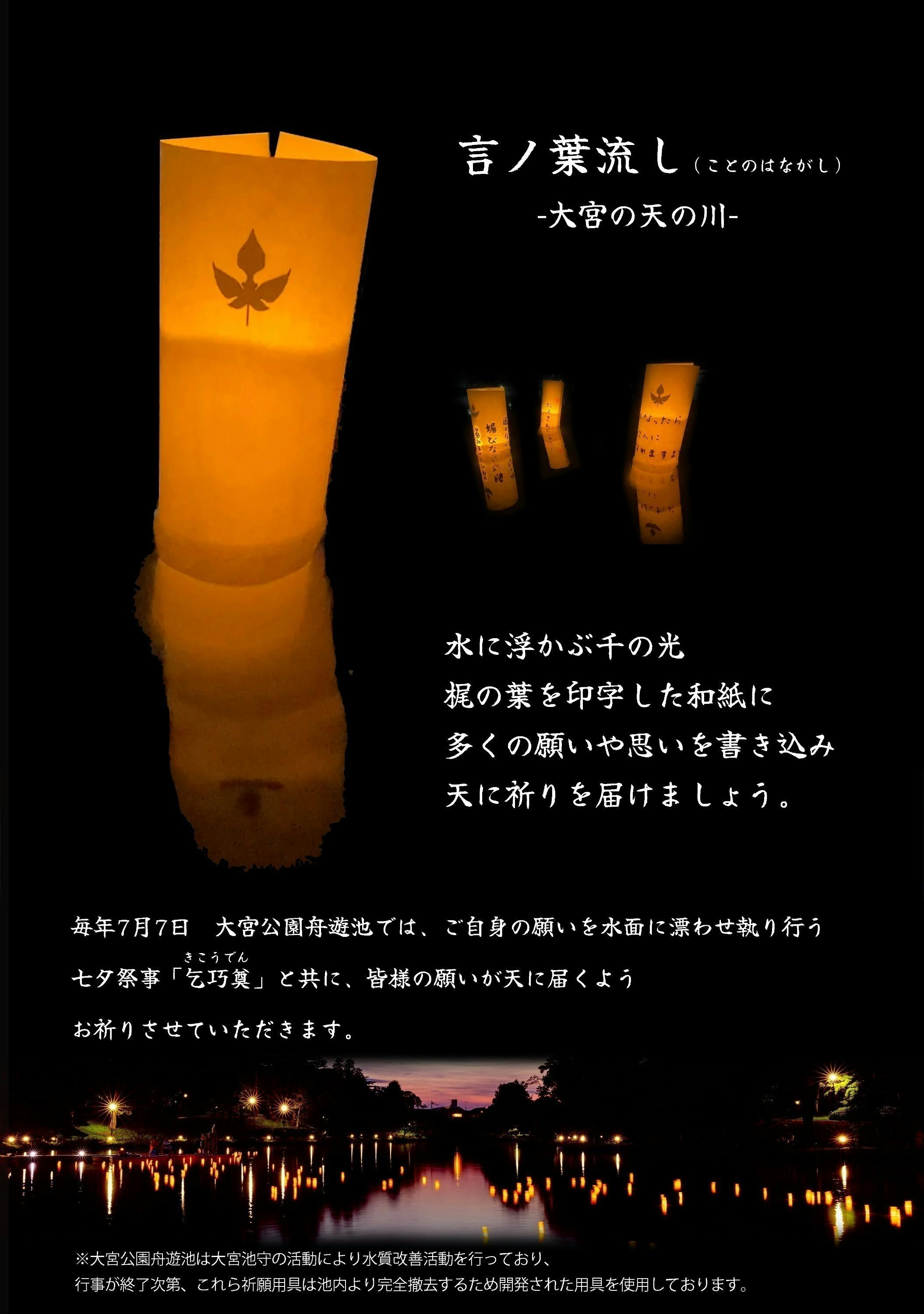 大宮公園ボート池に流します。ひとりひとりの願い事がボート池を漂い、天の川の様相を演出いたします。