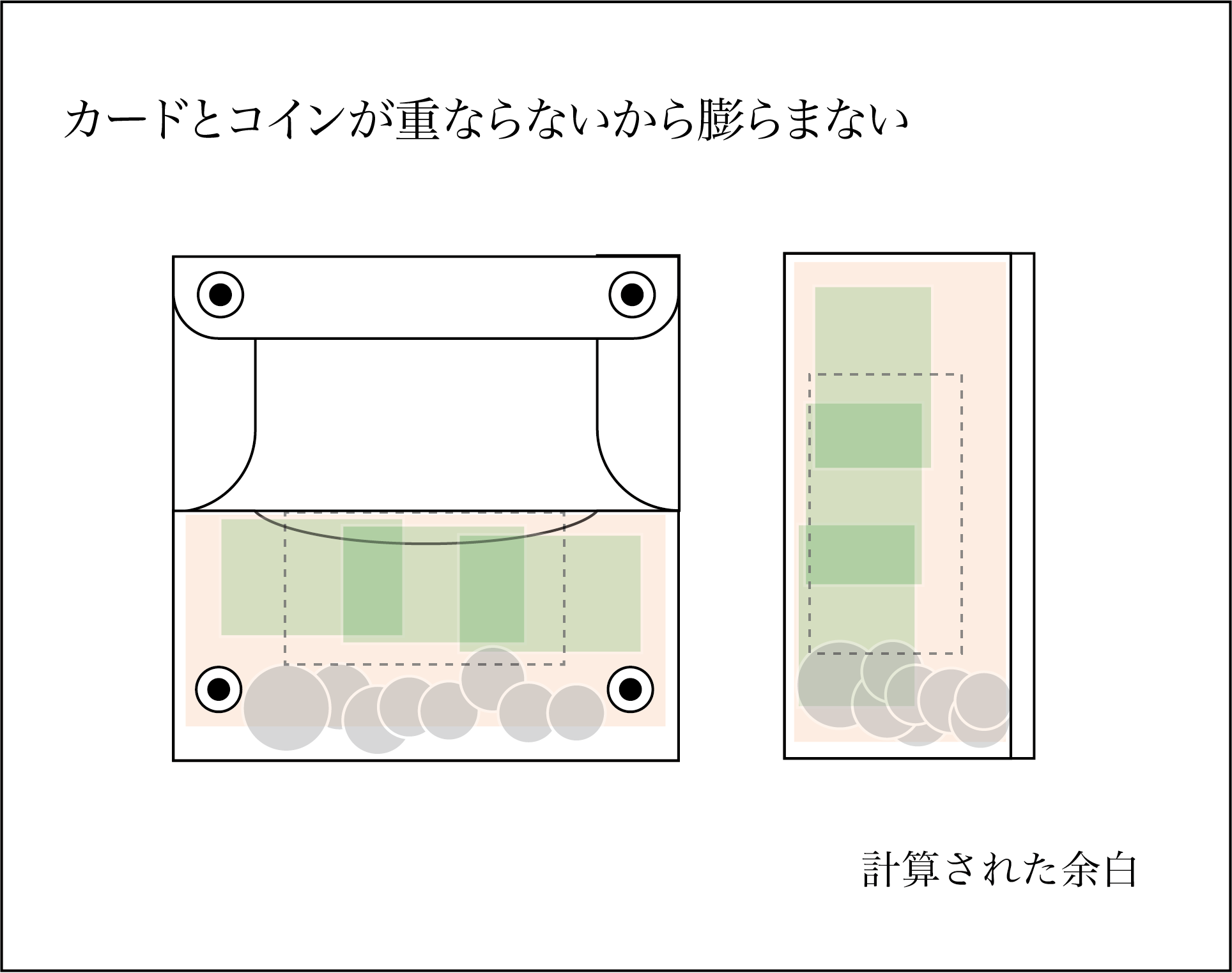 カードポケットには底上げ構造を採用し、コインとの干渉を防ぐことで、出し入れのスムーズさを高めています。