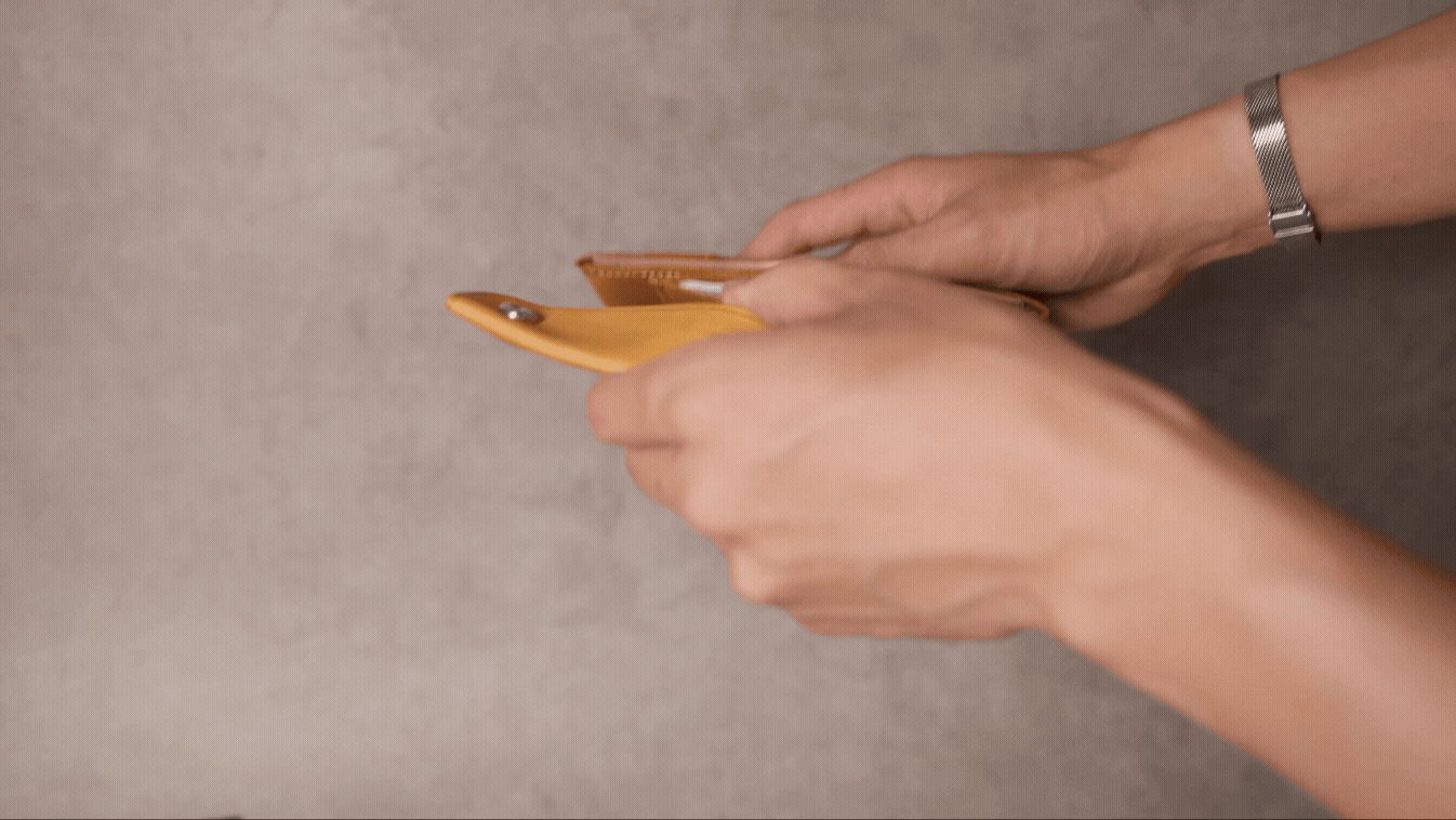 革の重なりを最小限に抑えることで、全体の厚みをスリムに仕上げ、見た目にも持ち運びにもスマートさを実現しています。